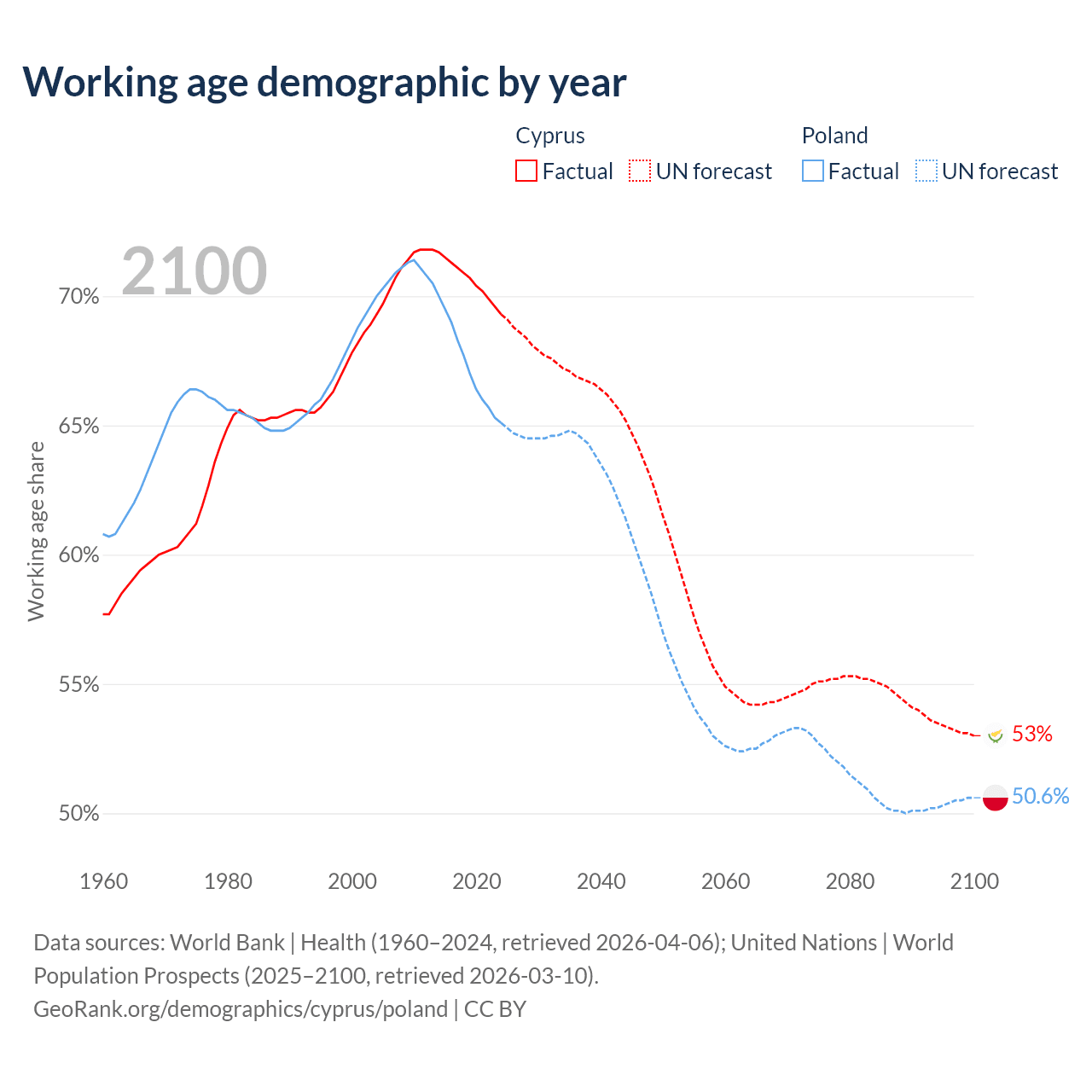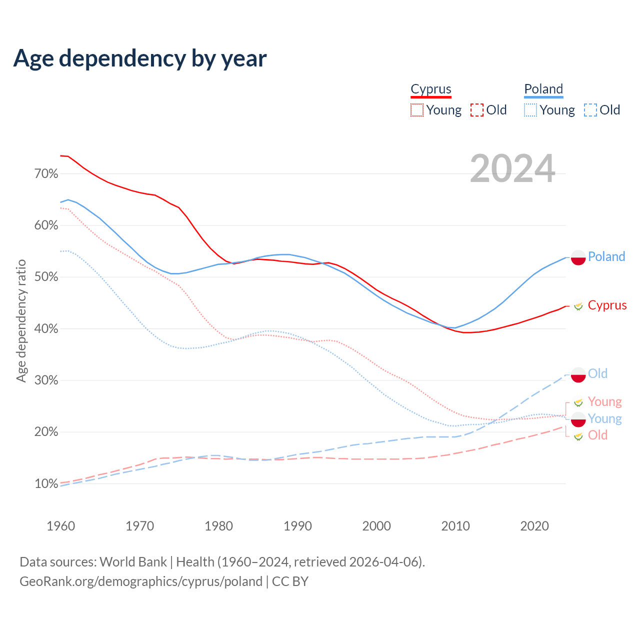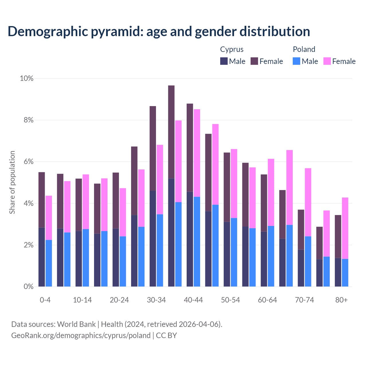 - Cyprus is ranked 52/196 by median age (oldest to youngest) vs 30/196 for Poland.