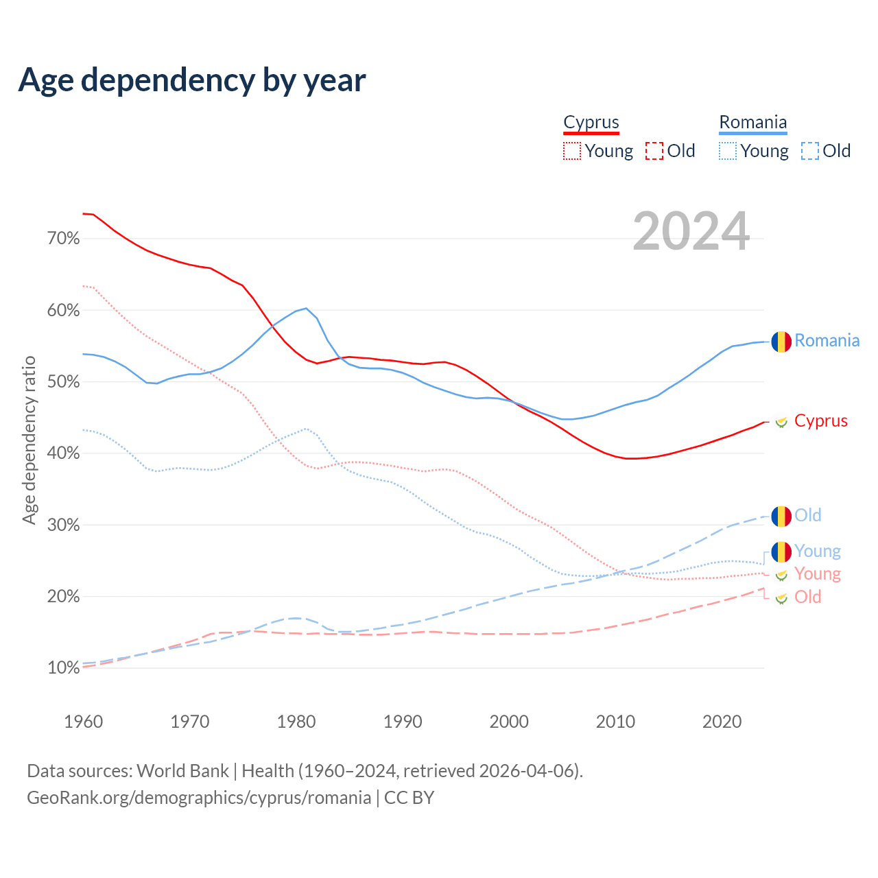 The share of older people aged 65 and over is 14.6% in Cyprus and 20% in Romania. Life expectancy in Cyprus compared to Romania .