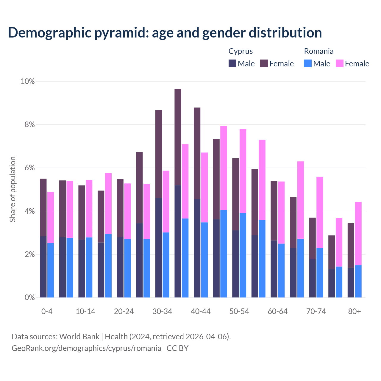 - Cyprus is ranked 52/196 by median age (oldest to youngest) vs 23/196 for Romania.
