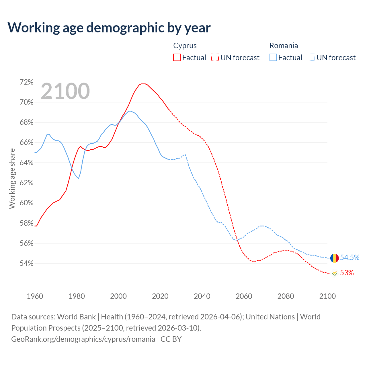 Median age Cyprus vs Romania, 1960-2100