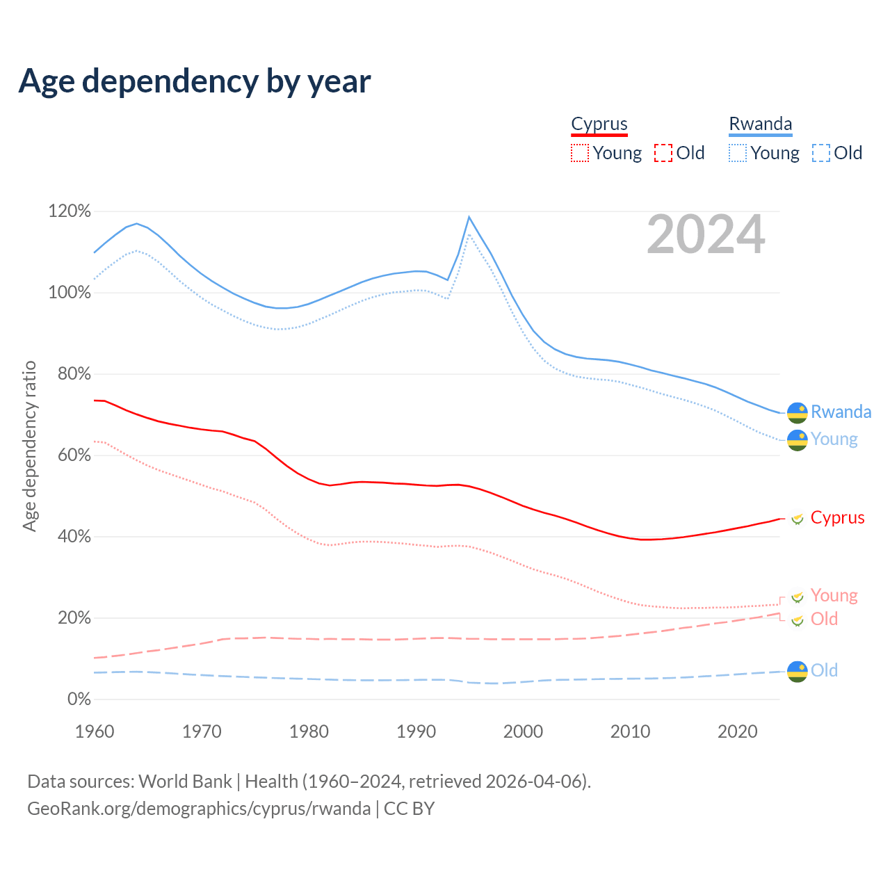 The share of older people aged 65 and over is 14.6% in Cyprus and 3.93% in Rwanda. Life expectancy in Cyprus compared to Rwanda .