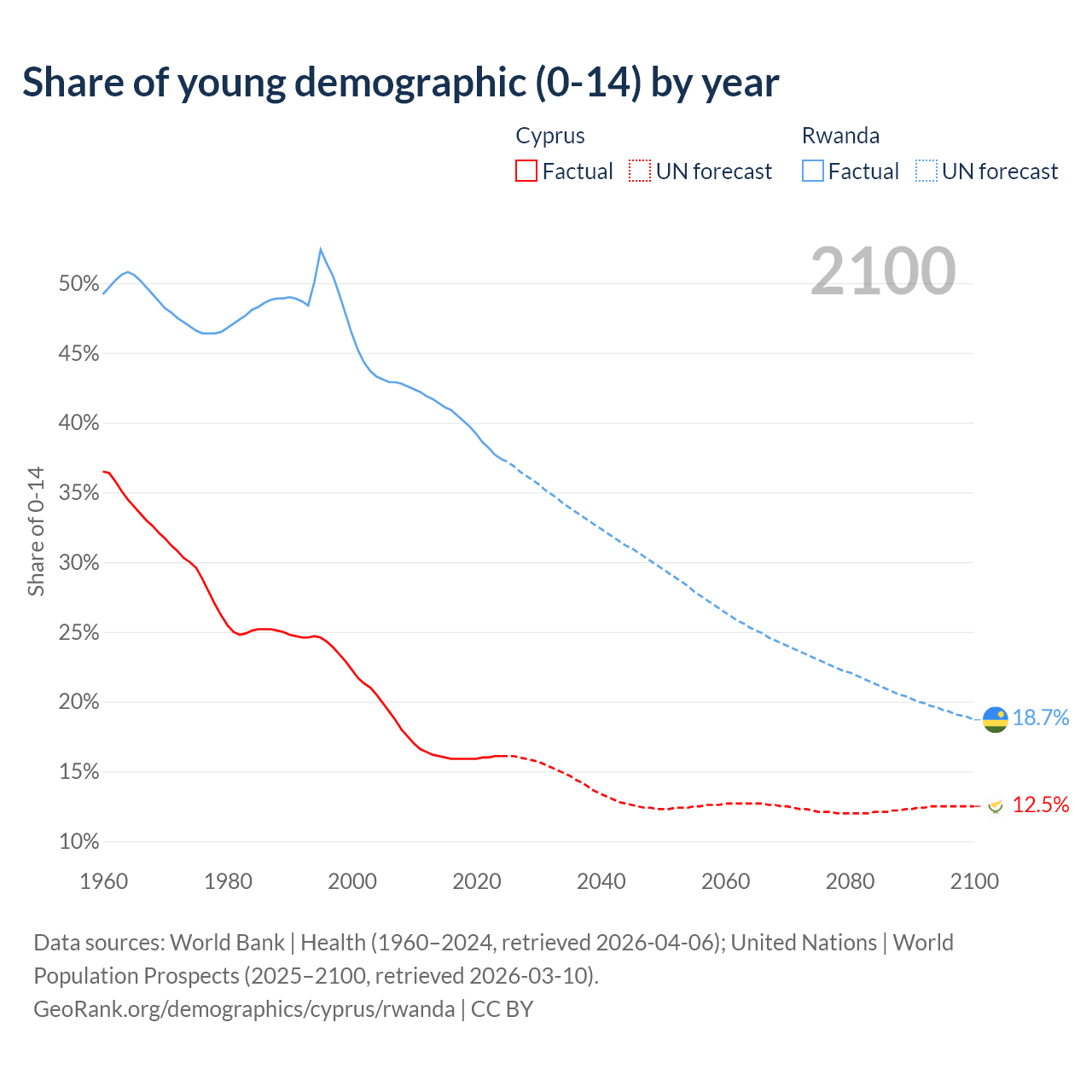 - The share of young demographic (0-15 years old) in Cyprus is 16.1% vs 37.4% in Rwanda.