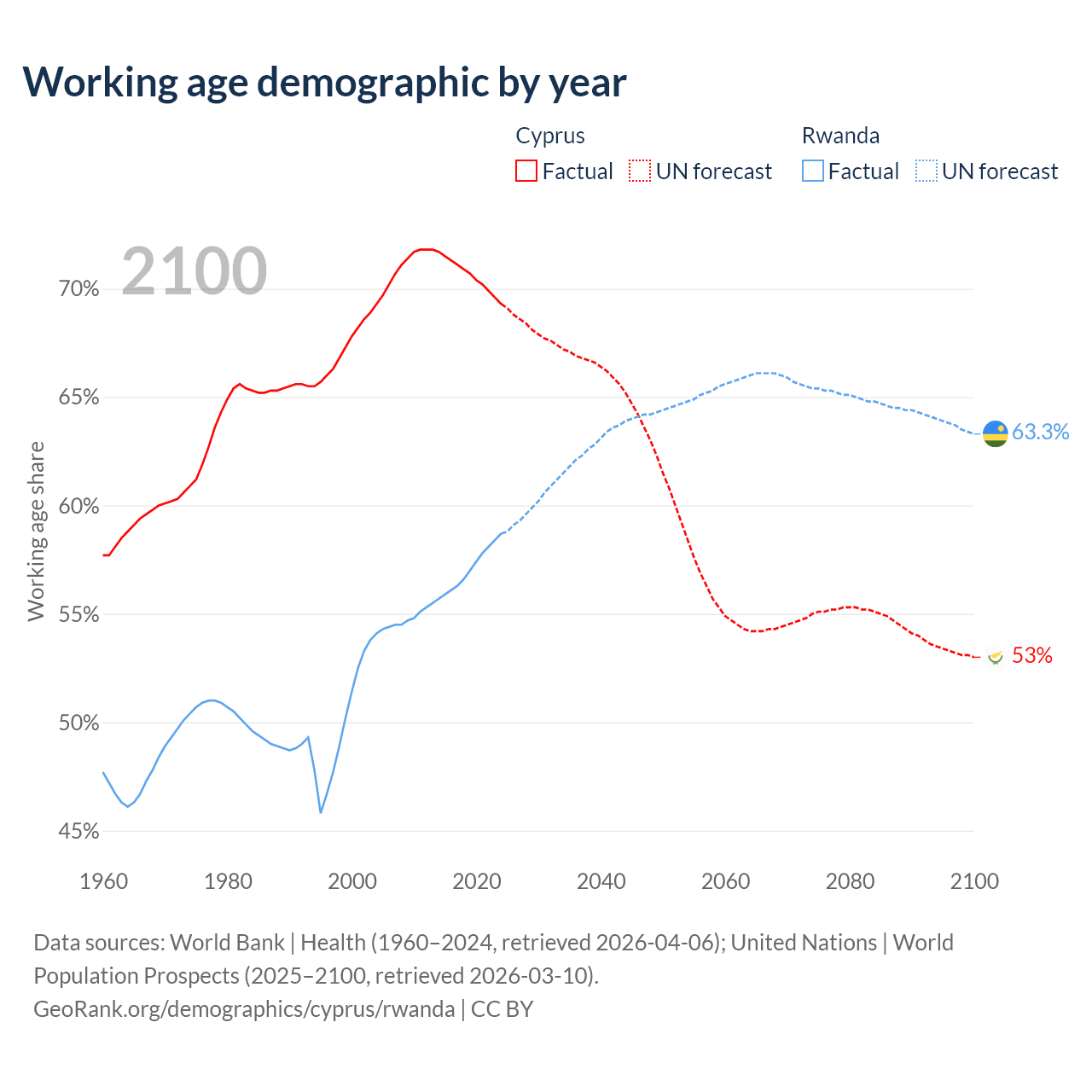 - Cyprus has 961K working age adults (aged 15-64) vs 8.79M in Rwanda.