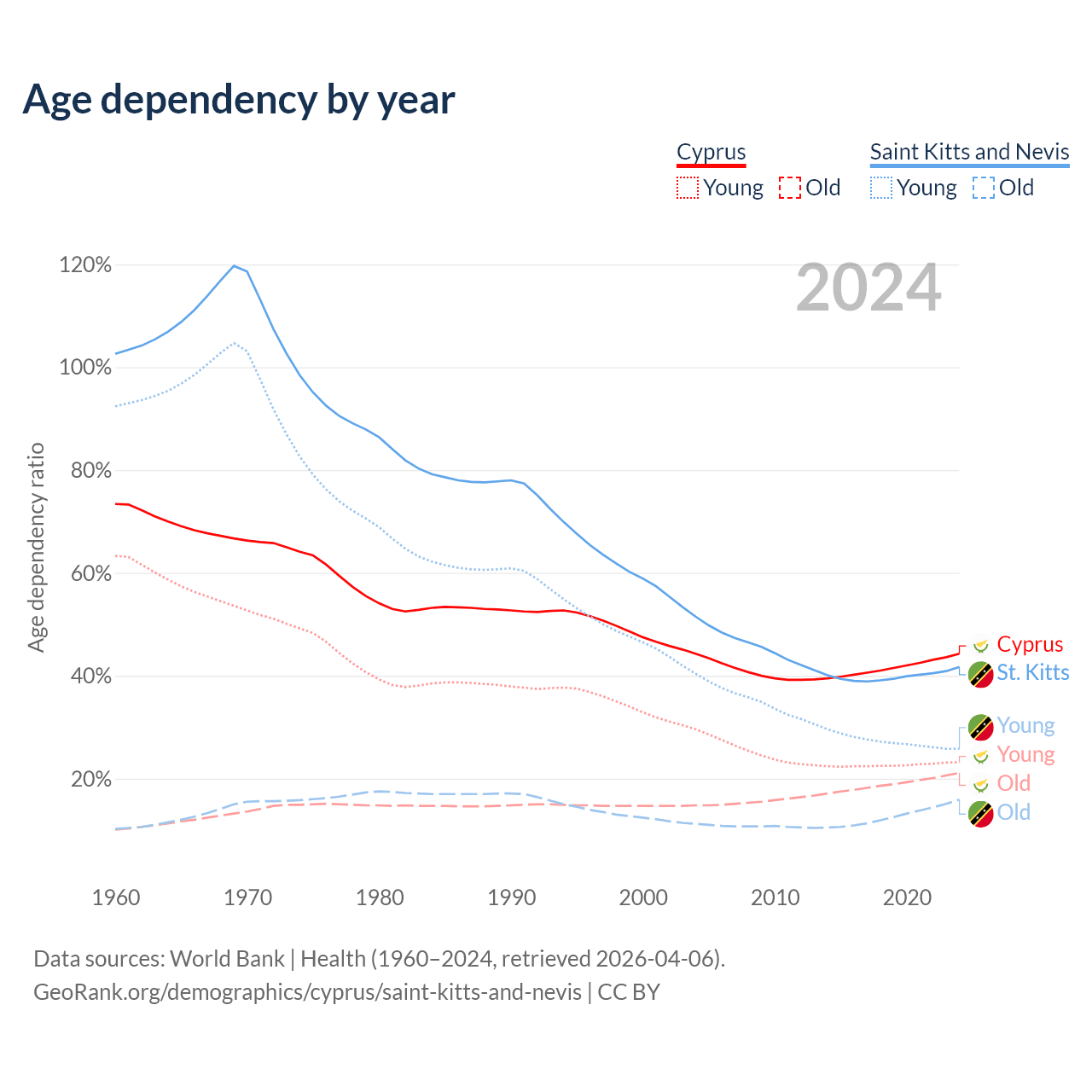 The share of older people aged 65 and over is 14.6% in Cyprus and 11.2% in Saint Kitts and Nevis. Life expectancy in Cyprus compared to Saint Kitts and Nevis .