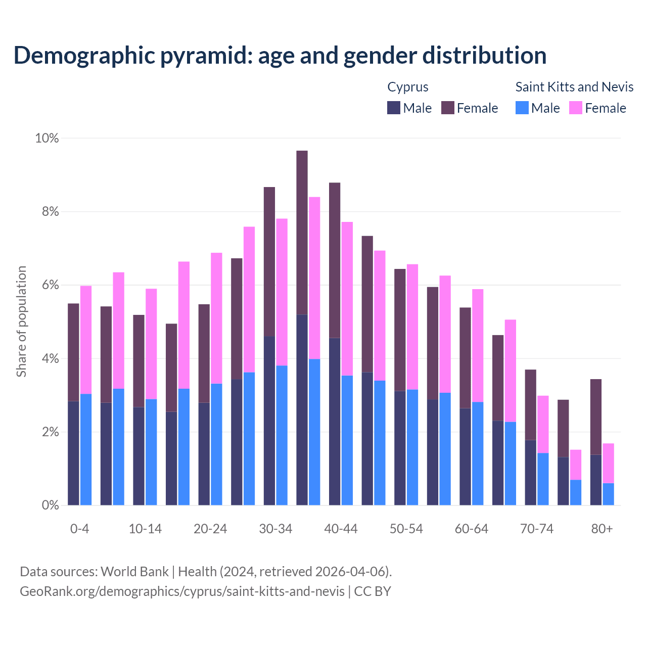 - As of 2026, the population of Cyprus is 1.39M vs 47K in Saint Kitts and Nevis - 29.5 times difference.