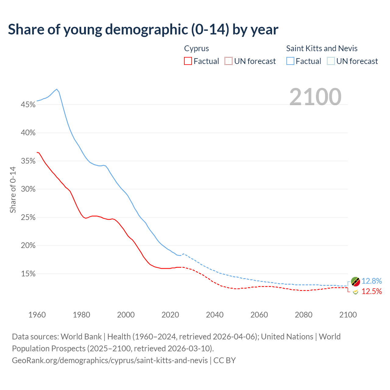 - The share of young demographic (0-15 years old) in Cyprus is 16.1% vs 18.2% in Saint Kitts and Nevis.