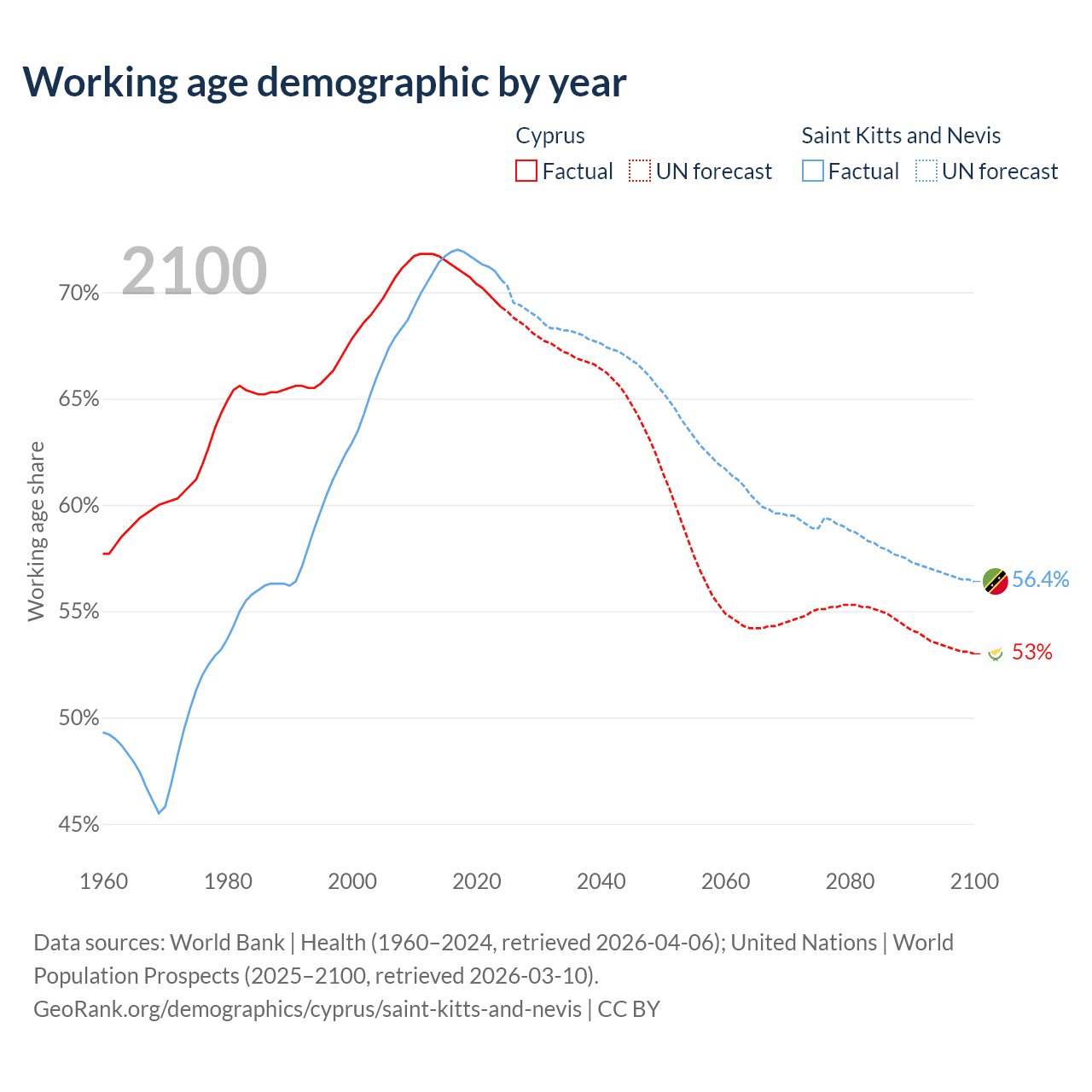 - Cyprus has 961K working age adults (aged 15-64) vs 33.2K in Saint Kitts and Nevis.