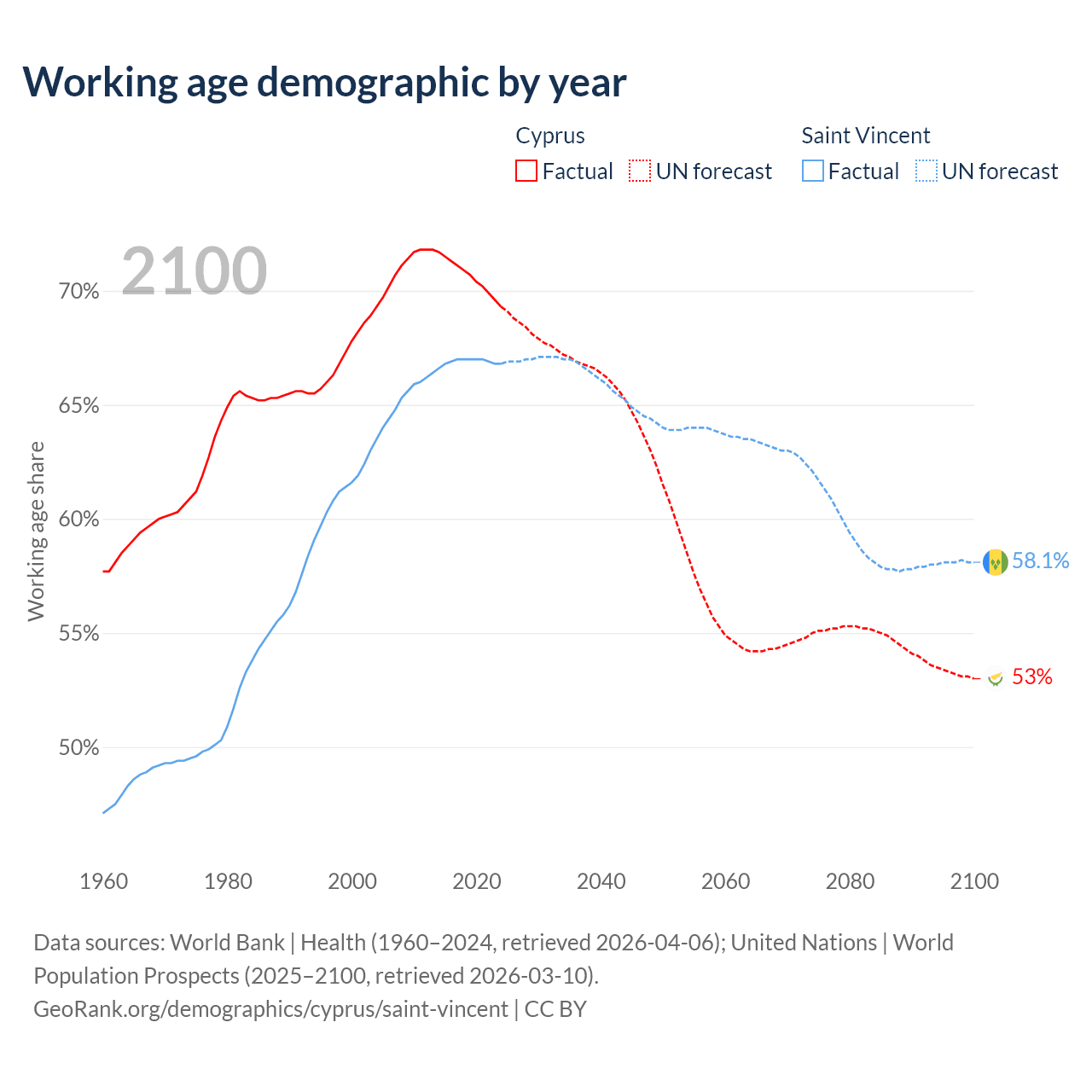 - Cyprus has 961K working age adults (aged 15-64) vs 66.3K in Saint Vincent.