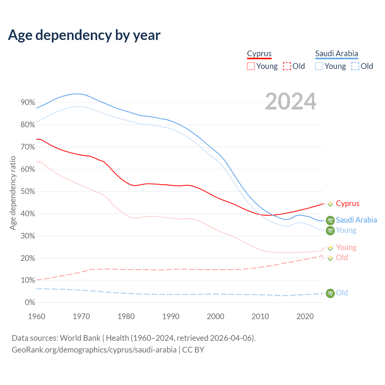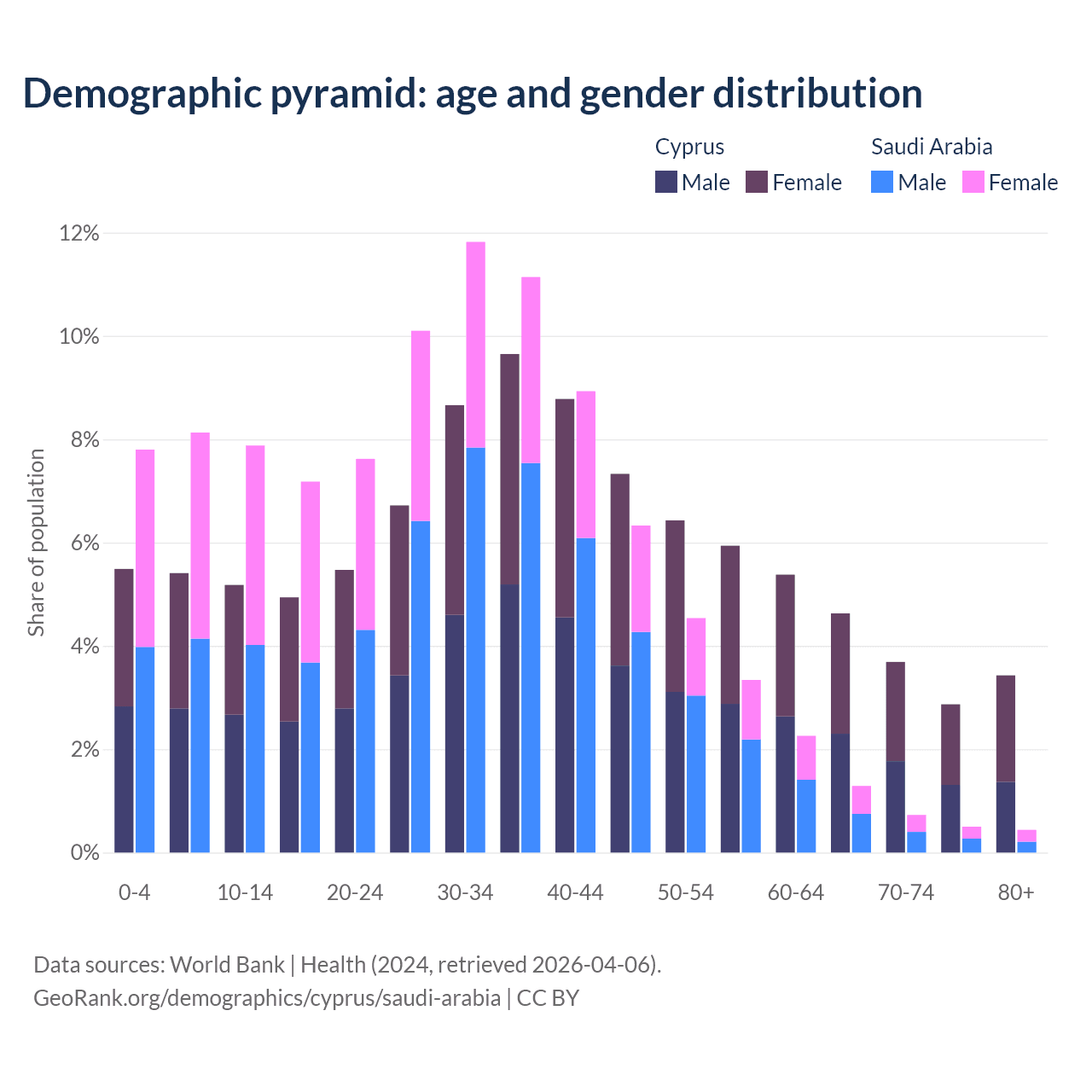 - Cyprus is ranked 52/196 by median age (oldest to youngest) vs 98/196 for Saudi Arabia.