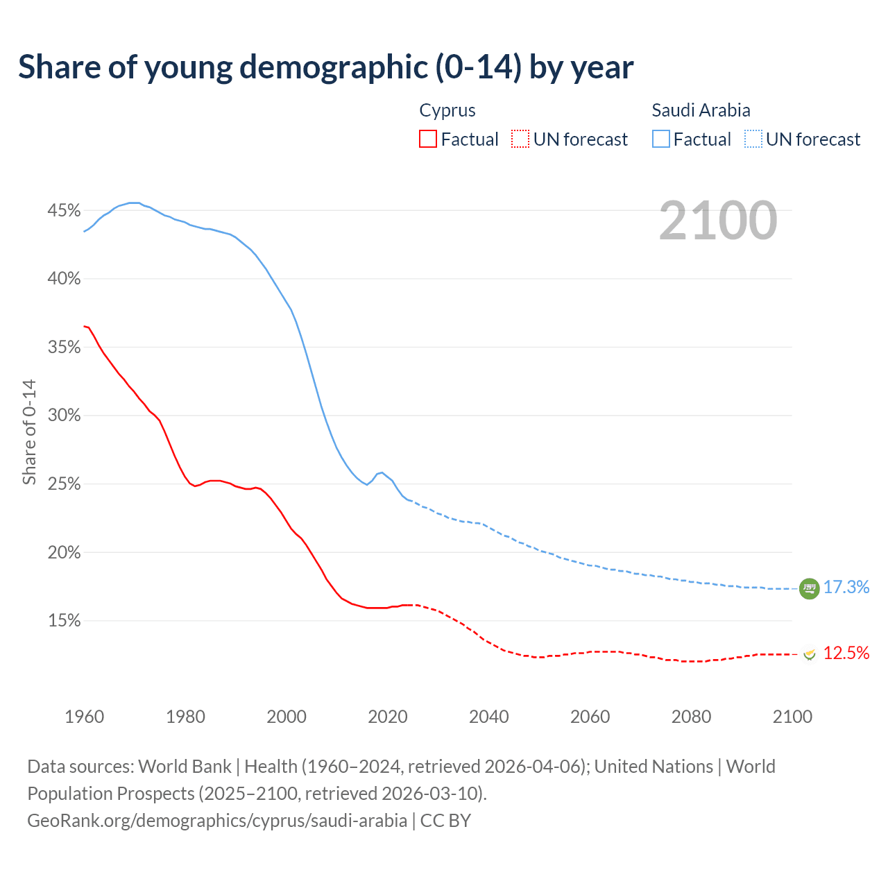 - The share of young demographic (0-15 years old) in Cyprus is 16.1% vs 23.8% in Saudi Arabia.