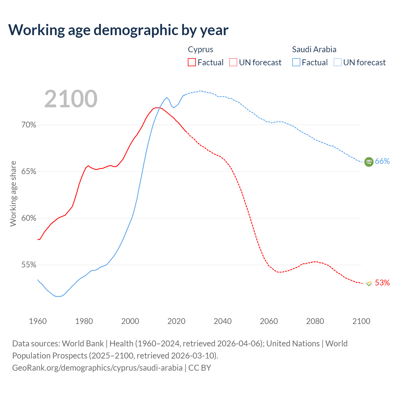 - Cyprus has 961K working age adults (aged 15-64) vs 26.9M in Saudi Arabia.