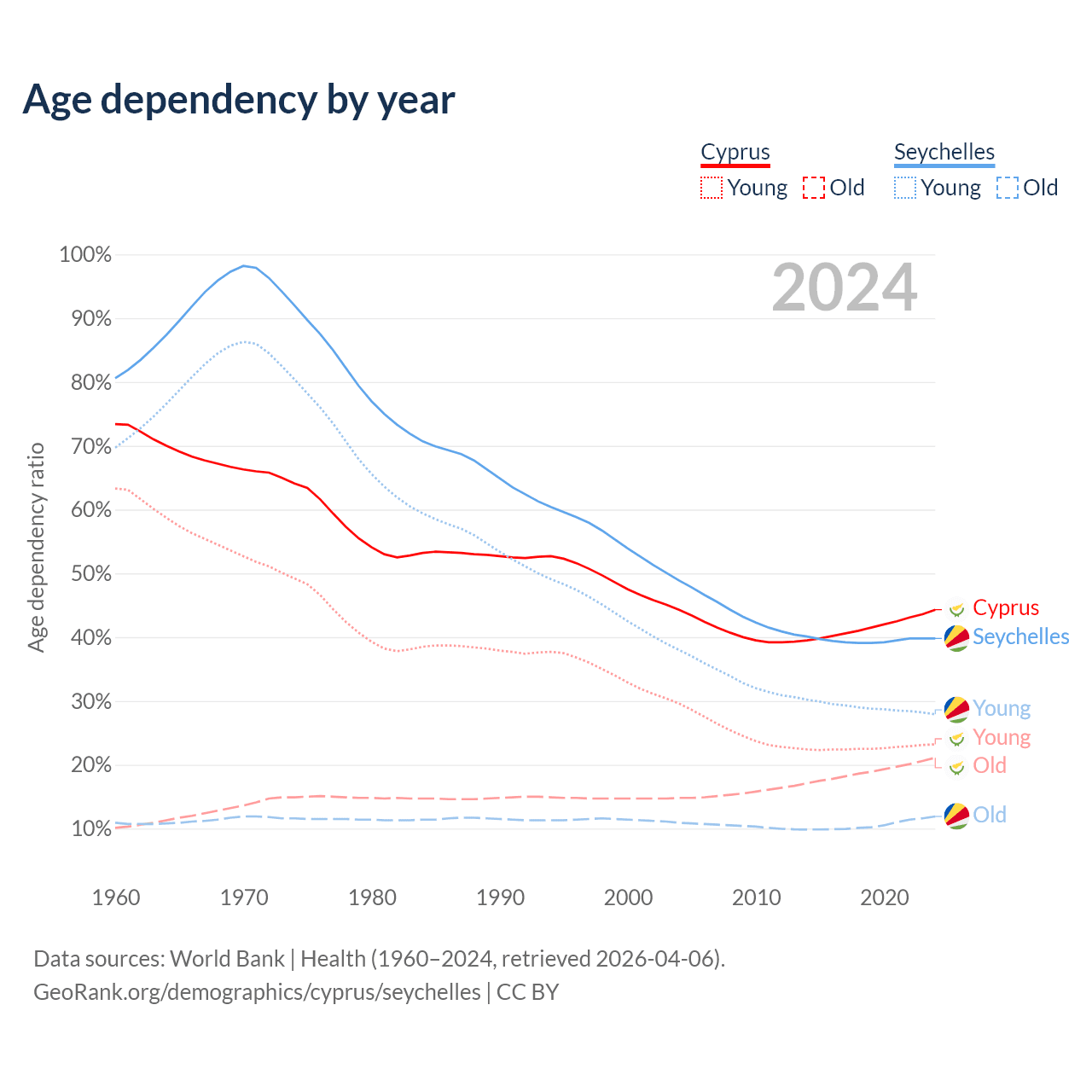 The share of older people aged 65 and over is 14.6% in Cyprus and 8.54% in the Seychelles. Life expectancy in Cyprus compared to the Seychelles .