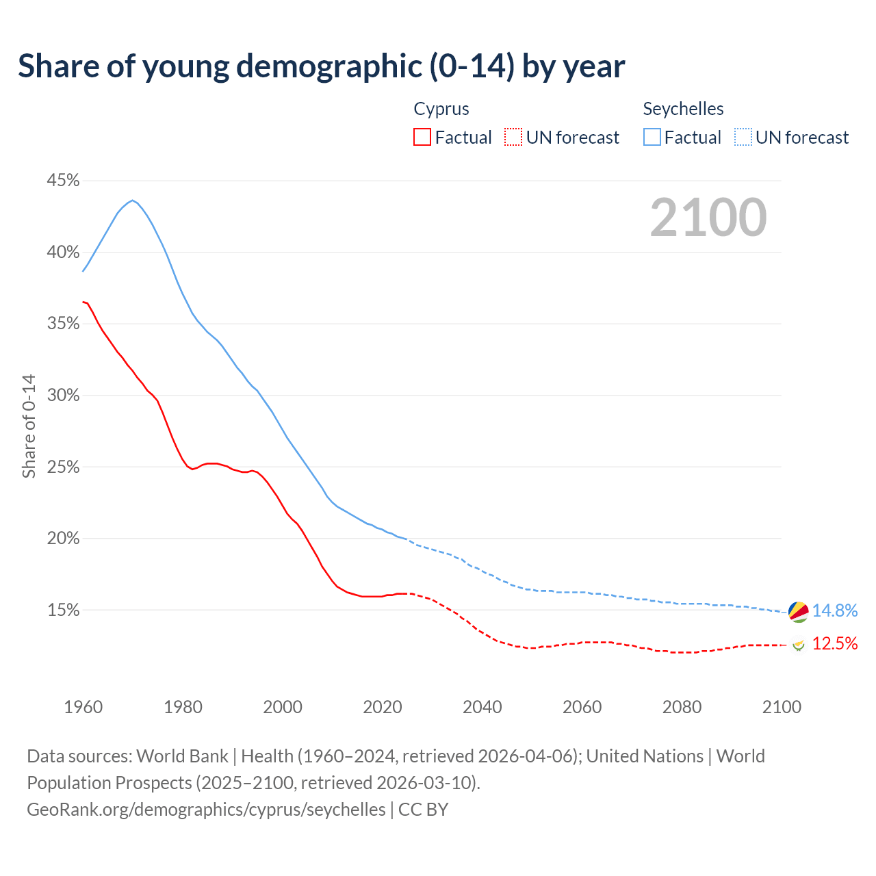 - The share of young demographic (0-15 years old) in Cyprus is 16.1% vs 20% in the Seychelles.