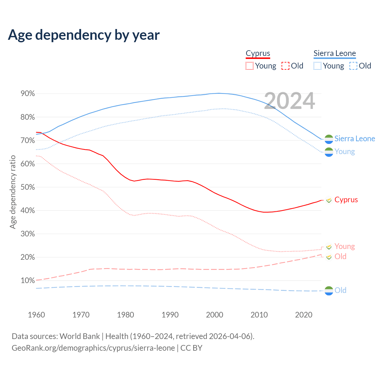 The share of older people aged 65 and over is 14.6% in Cyprus and 3.24% in Sierra Leone. Life expectancy in Cyprus compared to Sierra Leone .