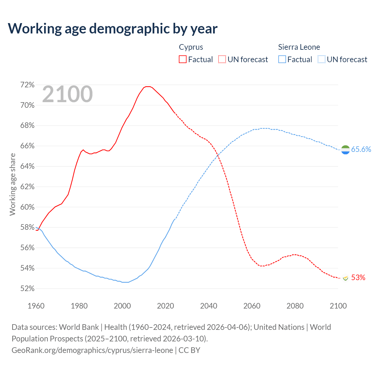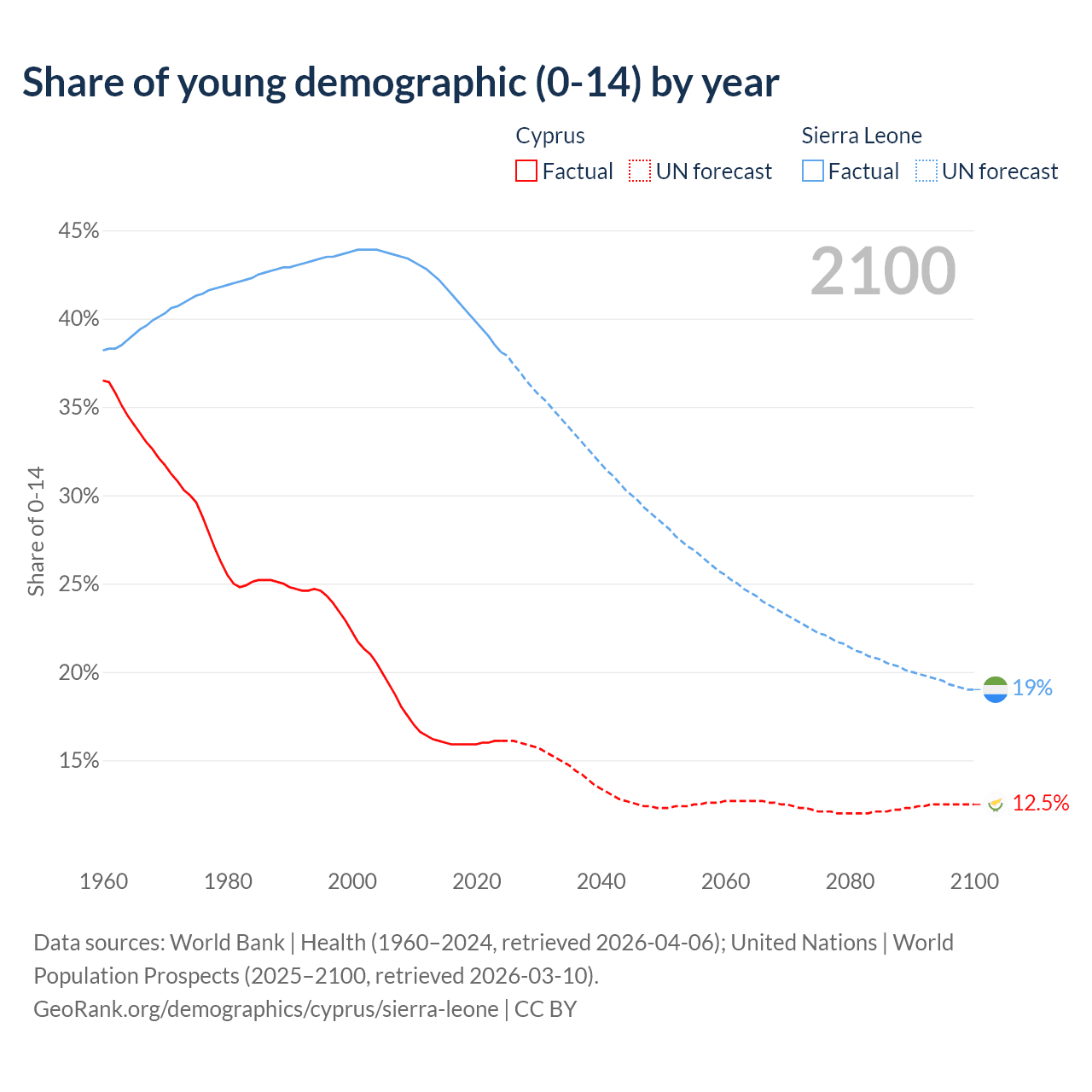 Median age Cyprus vs Sierra Leone, 1960-2100
