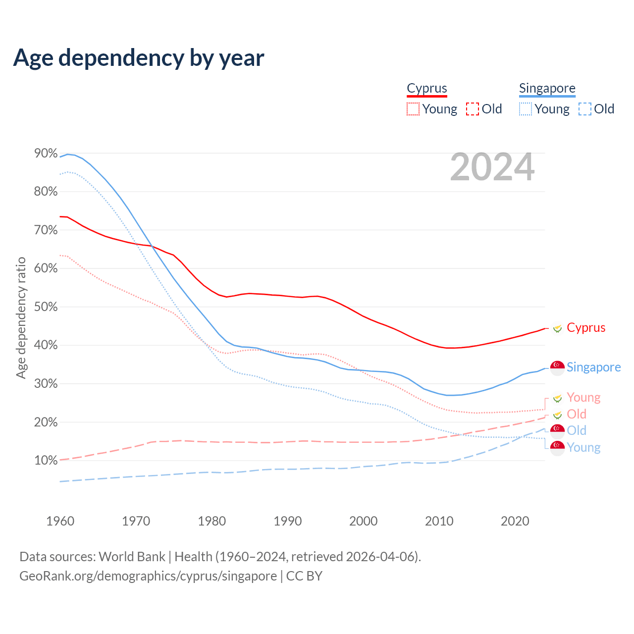 The share of older people aged 65 and over is 14.6% in Cyprus and 13.7% in Singapore. Life expectancy in Cyprus compared to Singapore .