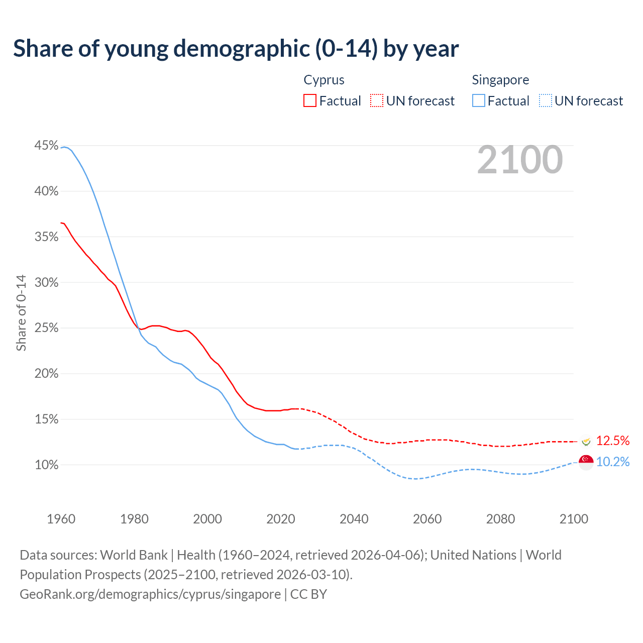- The share of young demographic (0-15 years old) in Cyprus is 16.1% vs 11.7% in Singapore.