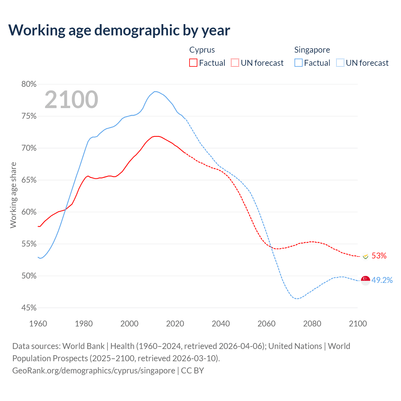 Median age Cyprus vs Singapore, 1960-2100