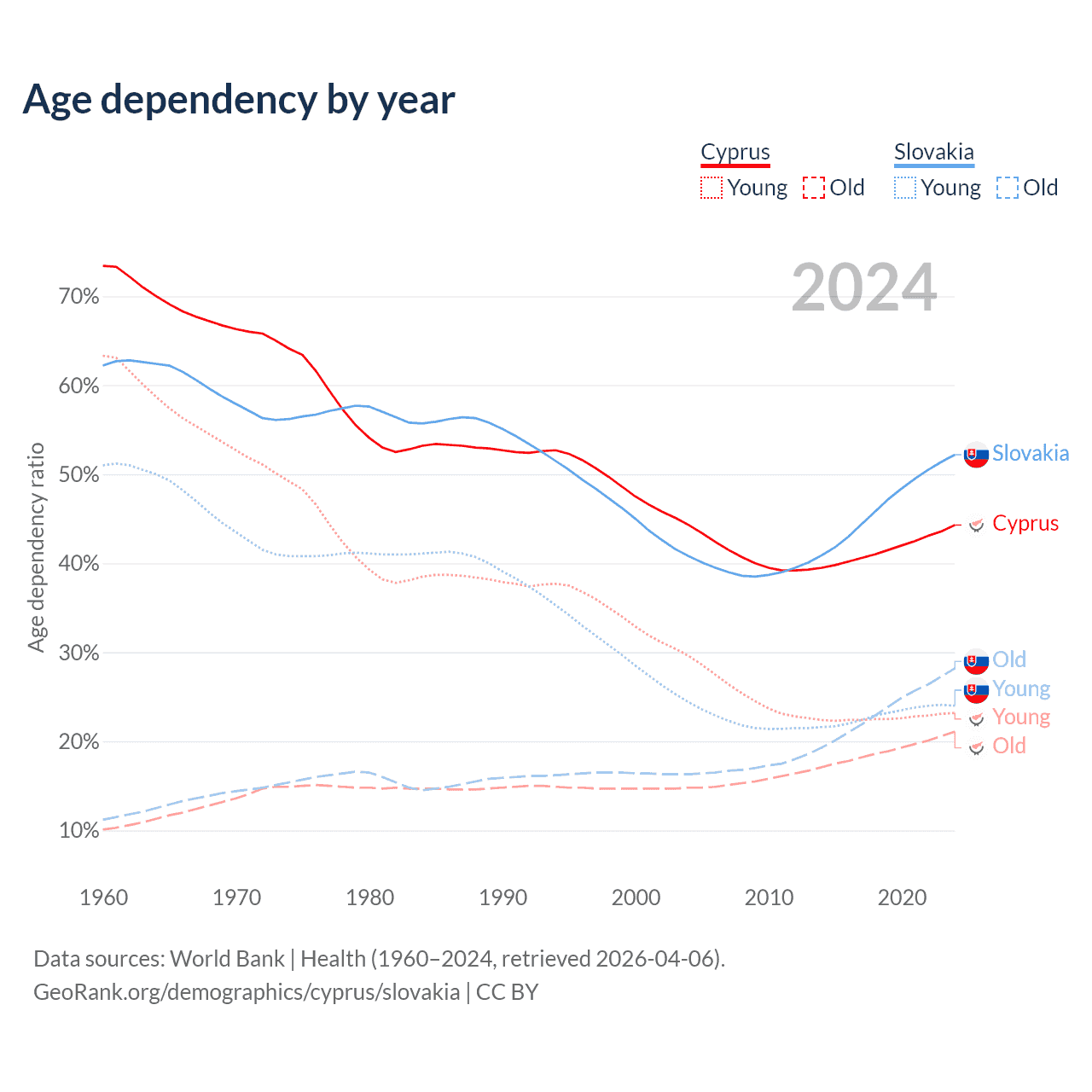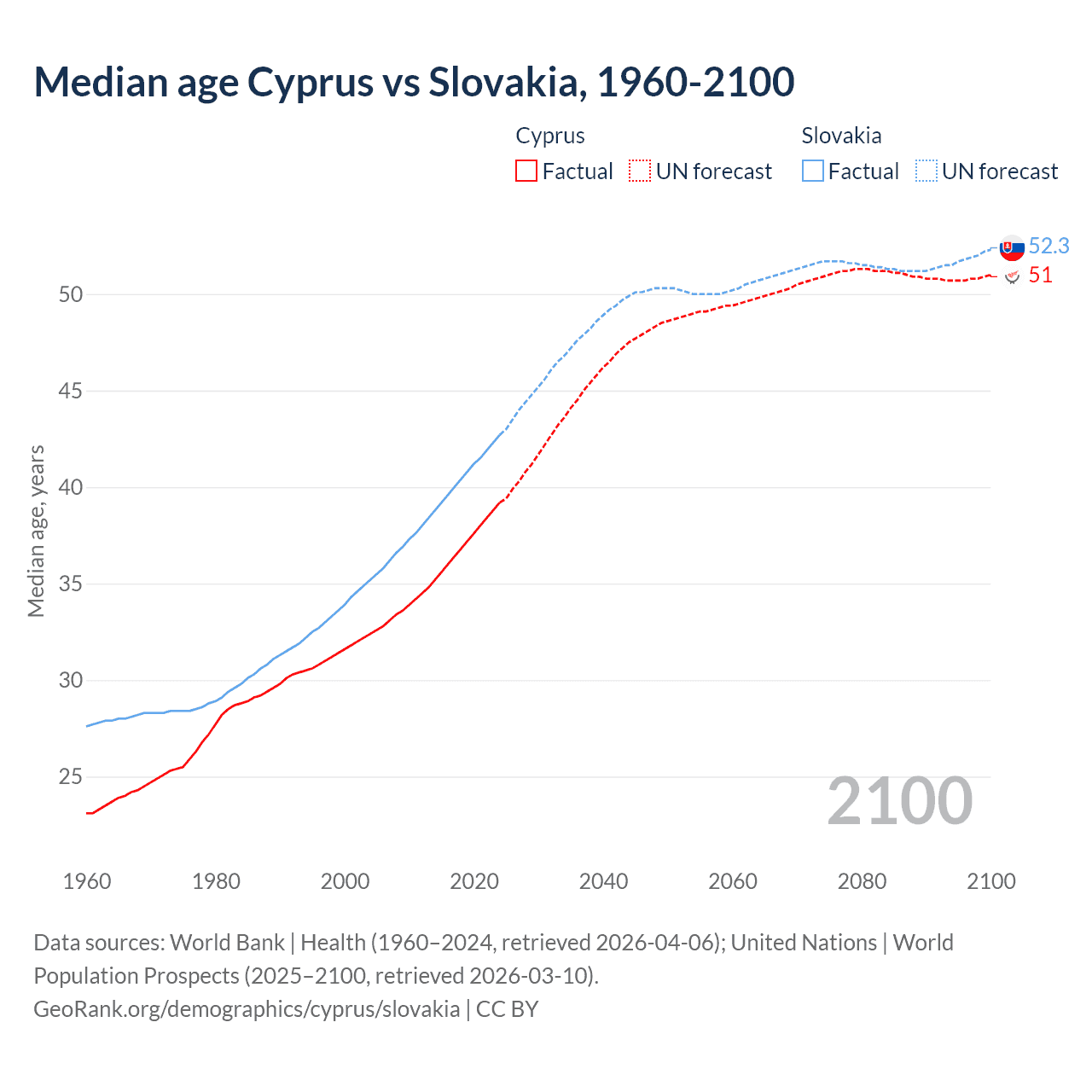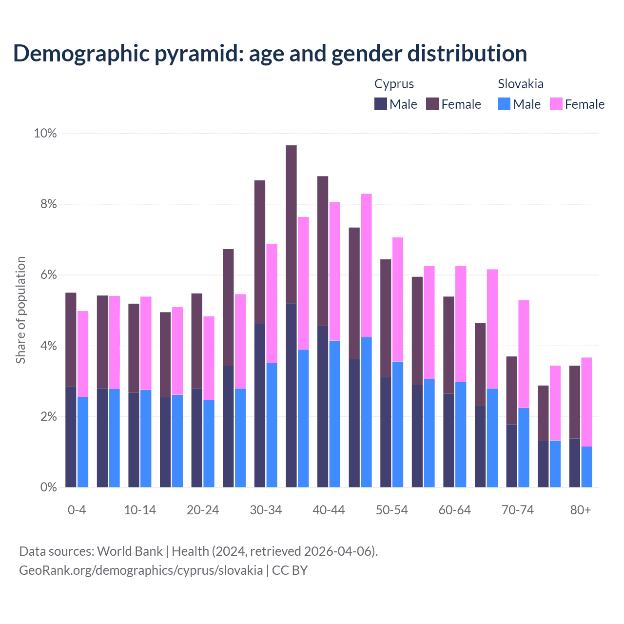 - Cyprus is ranked 52/196 by median age (oldest to youngest) vs 31/196 for Slovakia.