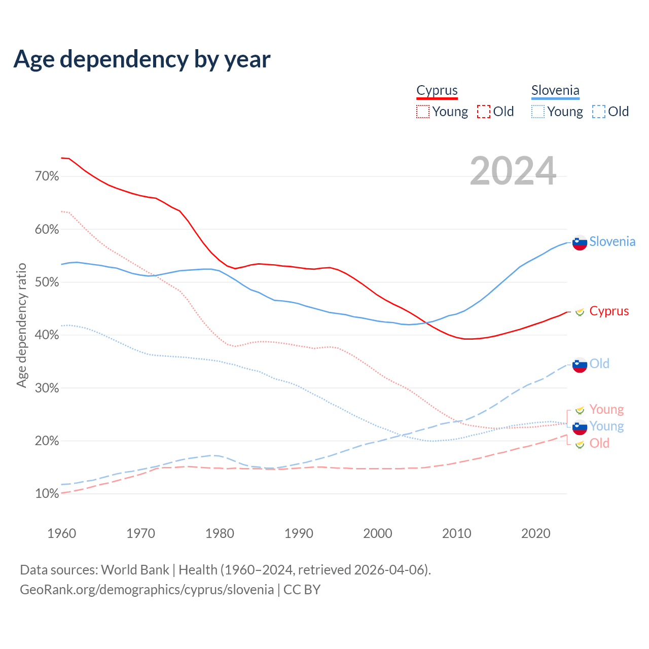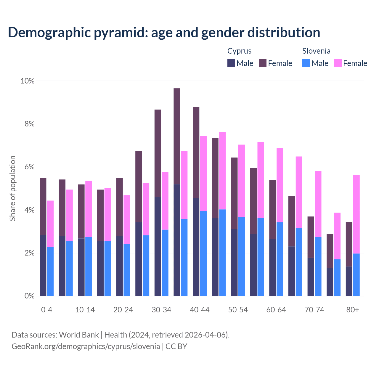 - Cyprus is ranked 52/196 by median age (oldest to youngest) vs 14/196 for Slovenia.