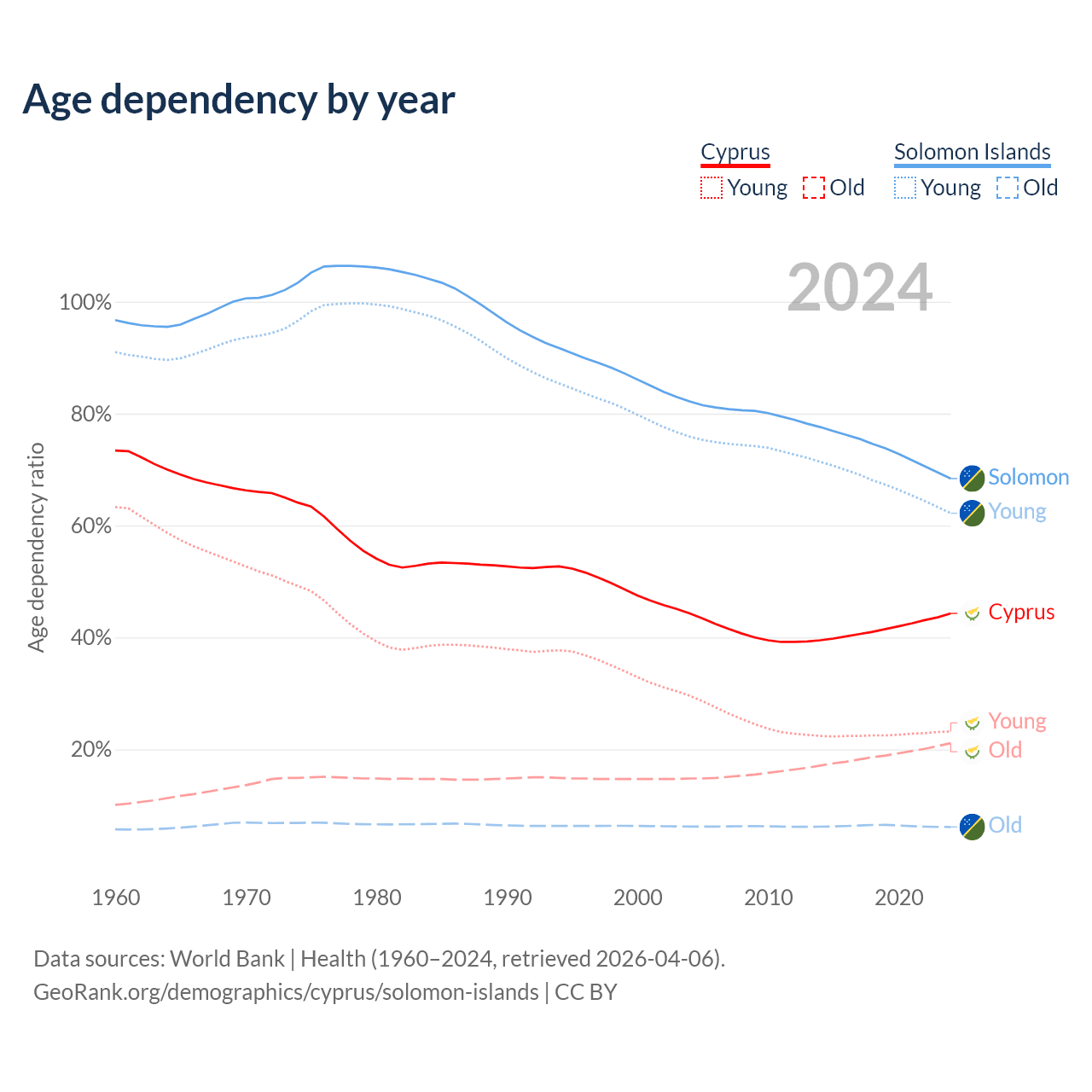 - The share of old-age demographic (65+) in Cyprus is 14.6% vs 3.64% in the Solomon Islands.