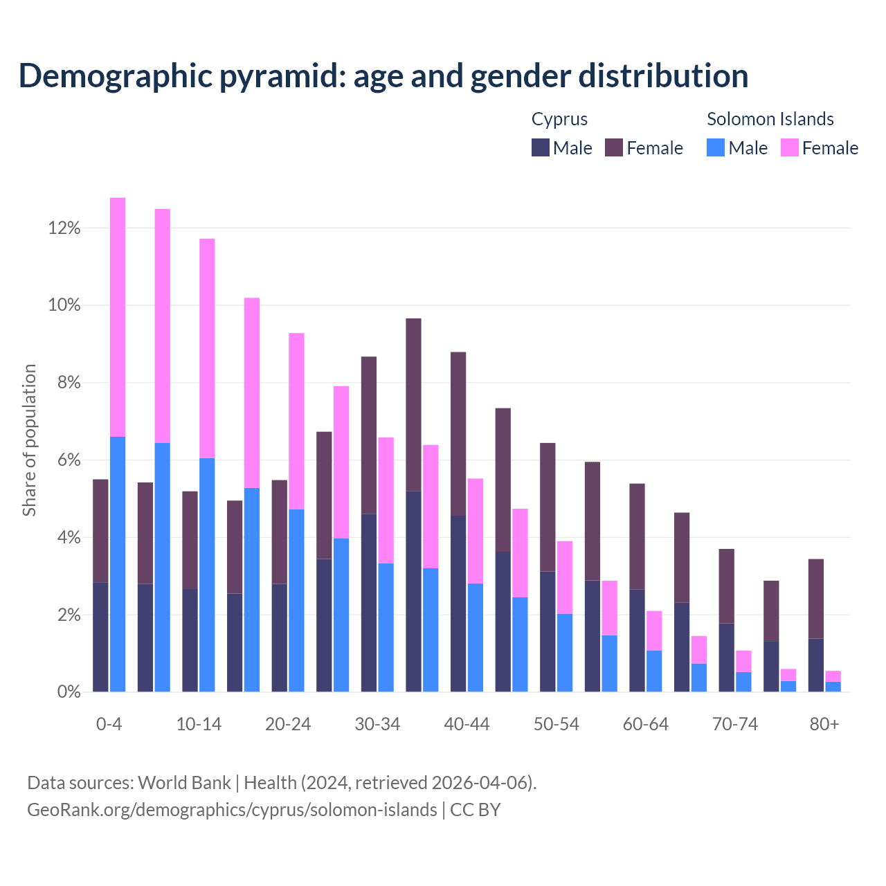 - As of 2026, the population of Cyprus is 1.39M vs 864K in the Solomon Islands - 1.6 times difference.