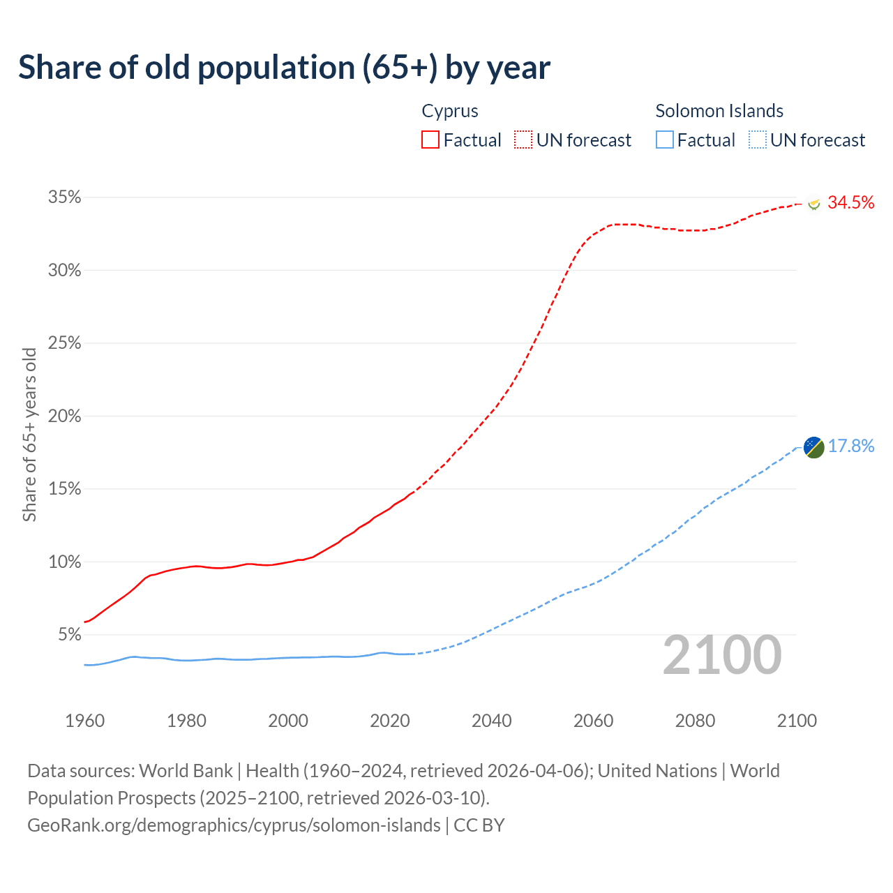 The share of older people aged 65 and over is 14.6% in Cyprus and 3.64% in the Solomon Islands. Life expectancy in Cyprus compared to the Solomon Islands .