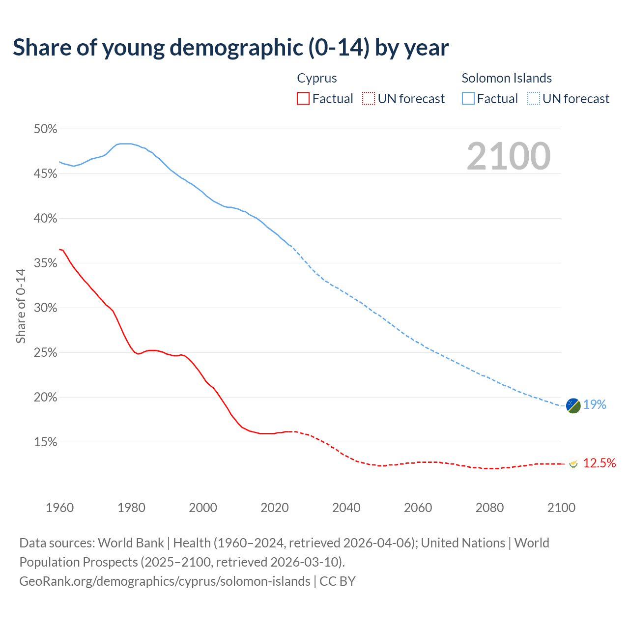 - The share of young demographic (0-15 years old) in Cyprus is 16.1% vs 37% in the Solomon Islands.