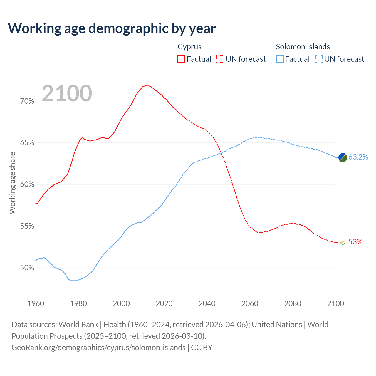 - Cyprus has 961K working age adults (aged 15-64) vs 513K in the Solomon Islands.