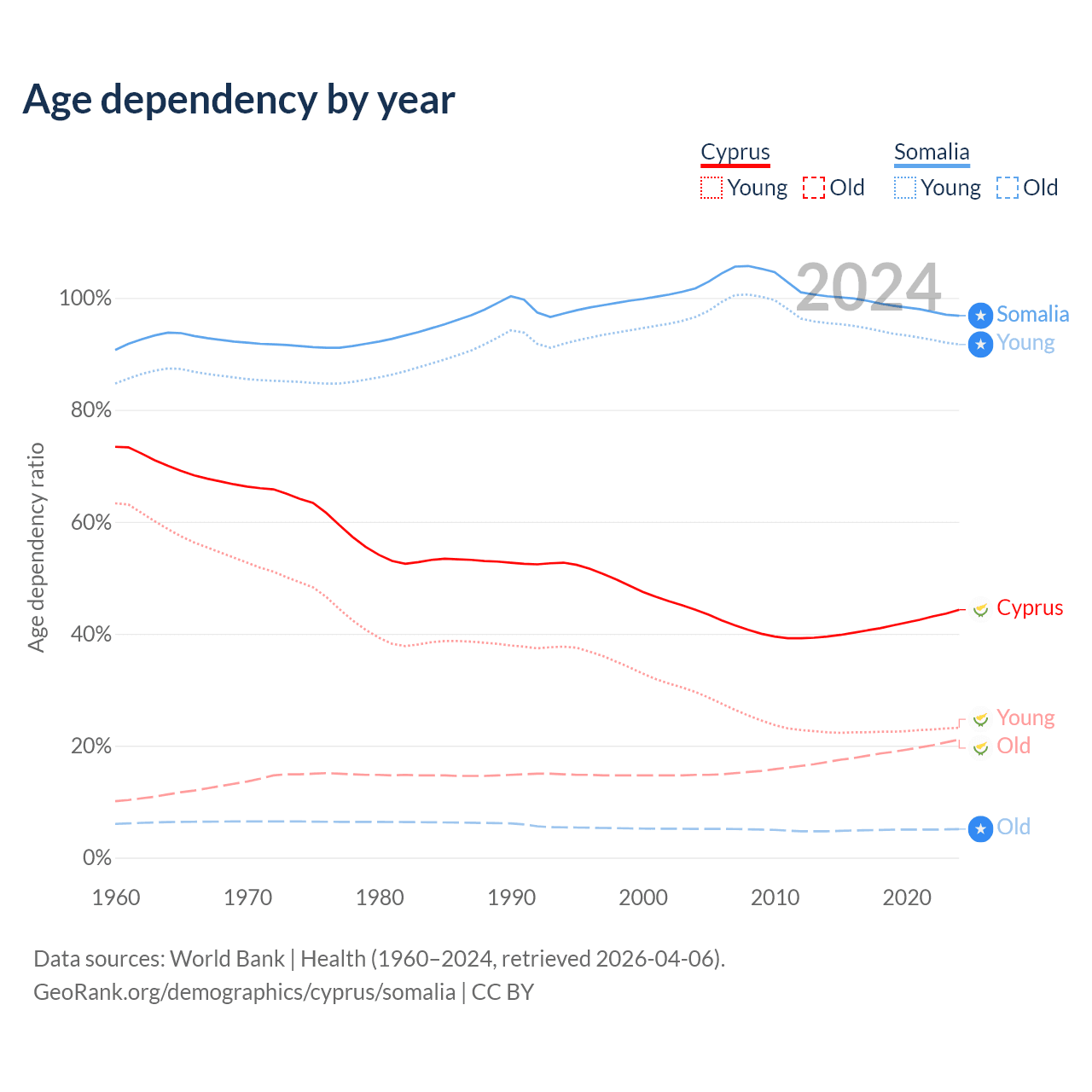 - The share of old-age demographic (65+) in Cyprus is 14.6% vs 2.59% in Somalia.