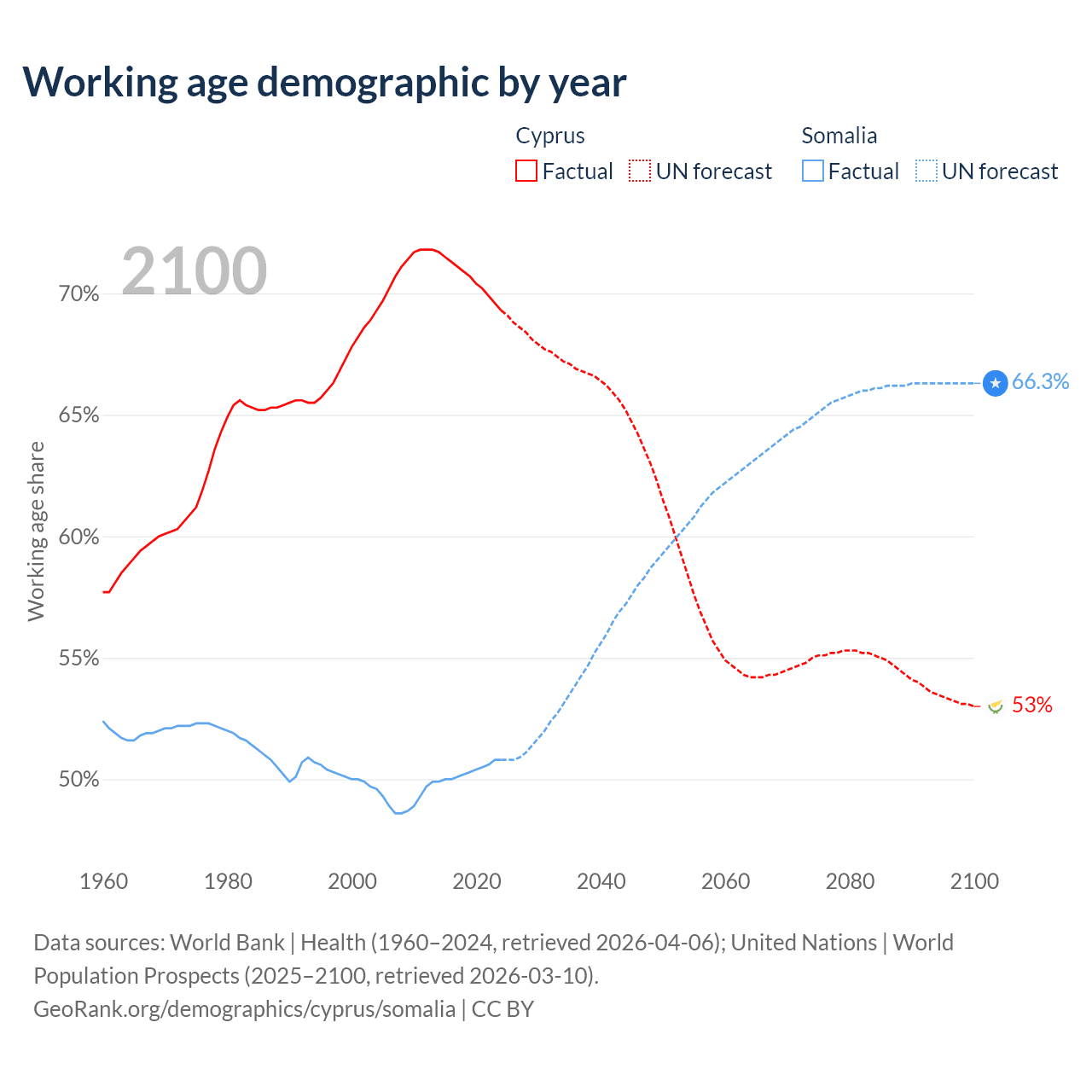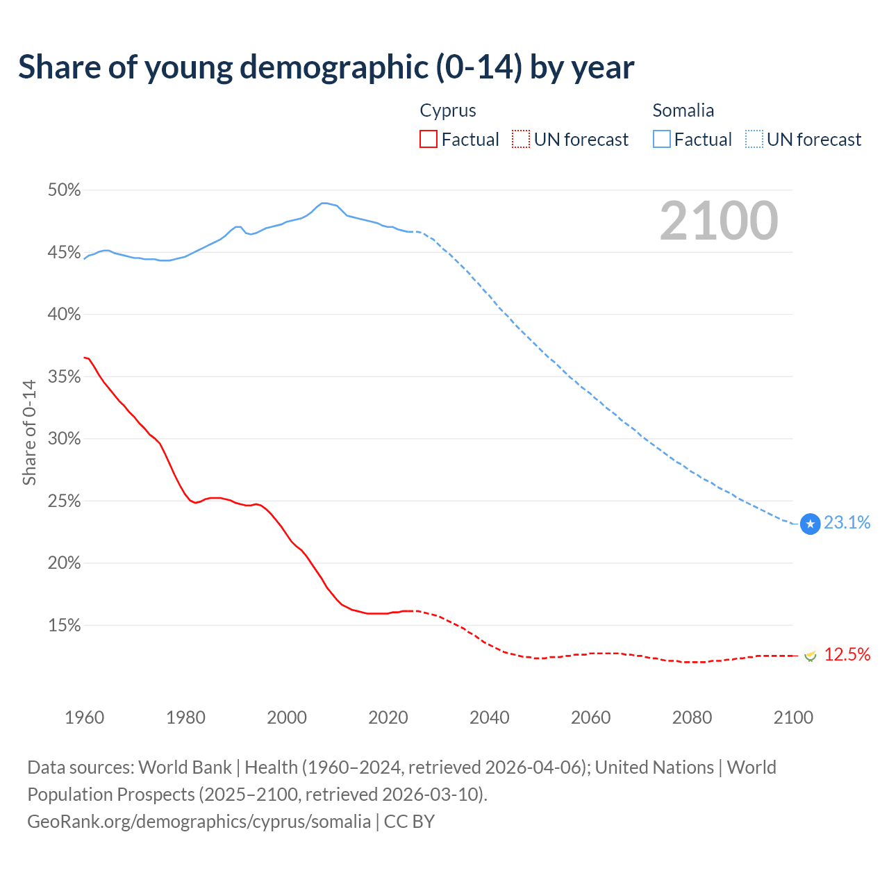 - The share of young demographic (0-15 years old) in Cyprus is 16.1% vs 46.6% in Somalia.