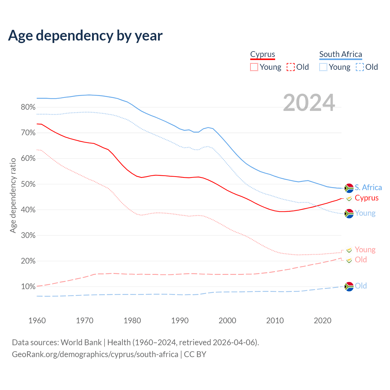 The share of older people aged 65 and over is 14.6% in Cyprus and 6.69% in South Africa. Life expectancy in Cyprus compared to South Africa .