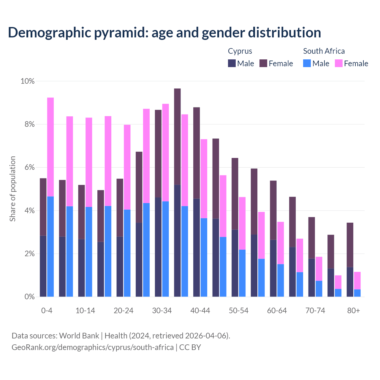 - Cyprus is ranked 52/196 by median age (oldest to youngest) vs 107/196 for South Africa.