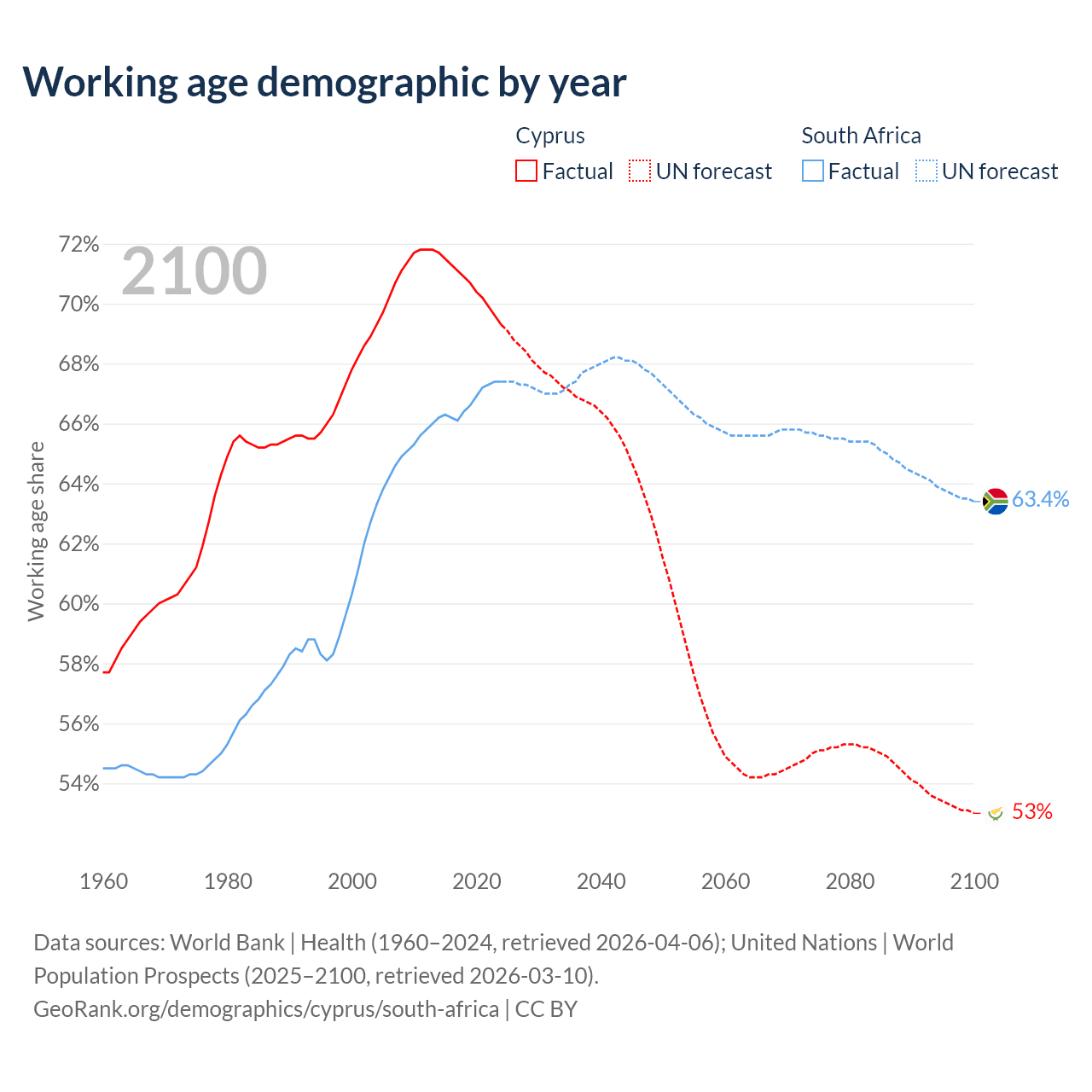 Median age Cyprus vs South Africa, 1960-2100