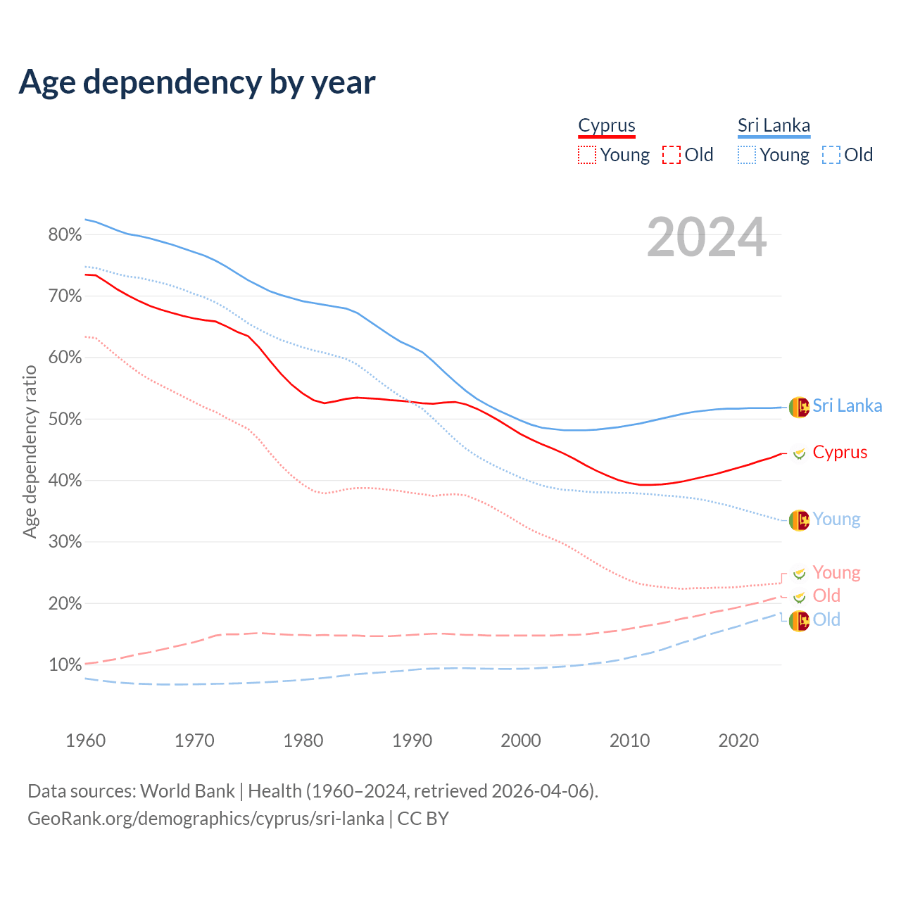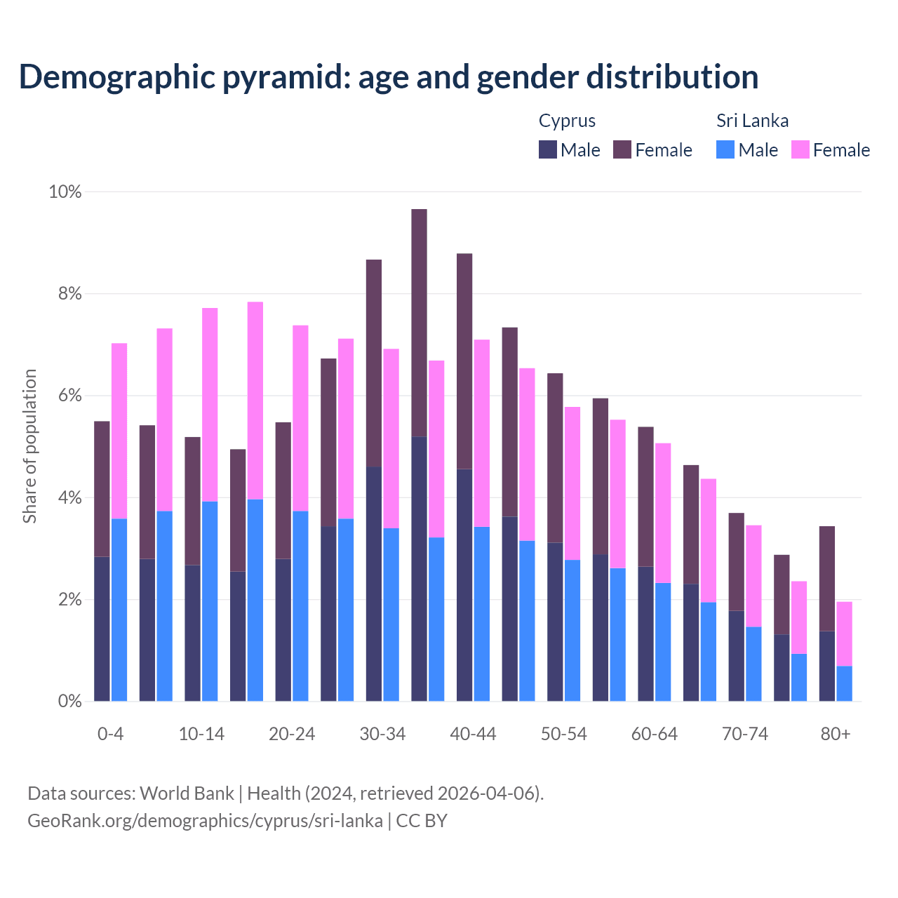 - Cyprus is ranked 52/196 by median age (oldest to youngest) vs 81/196 for Sri Lanka.