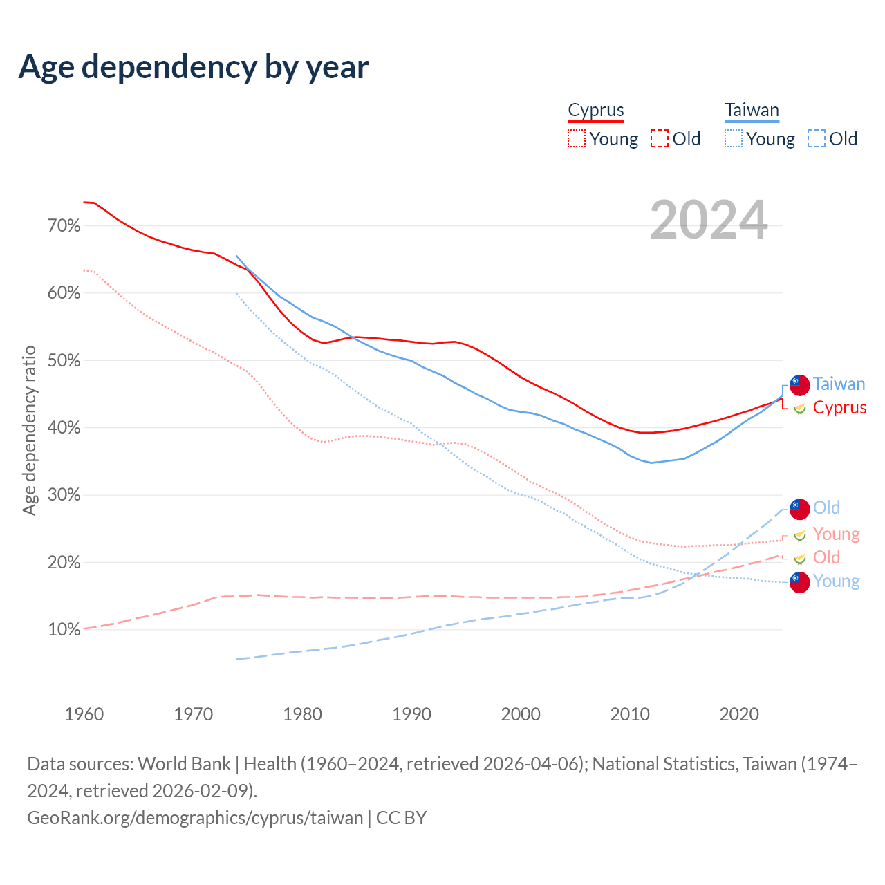 Data sources: World Bank | Health (1960–2024, retrieved 2026-04-06); U.S. Census Bureau (1960–2024, retrieved 2026-02-08); National Statistics, Taiwan (1974–2024, retrieved 2026-02-09).