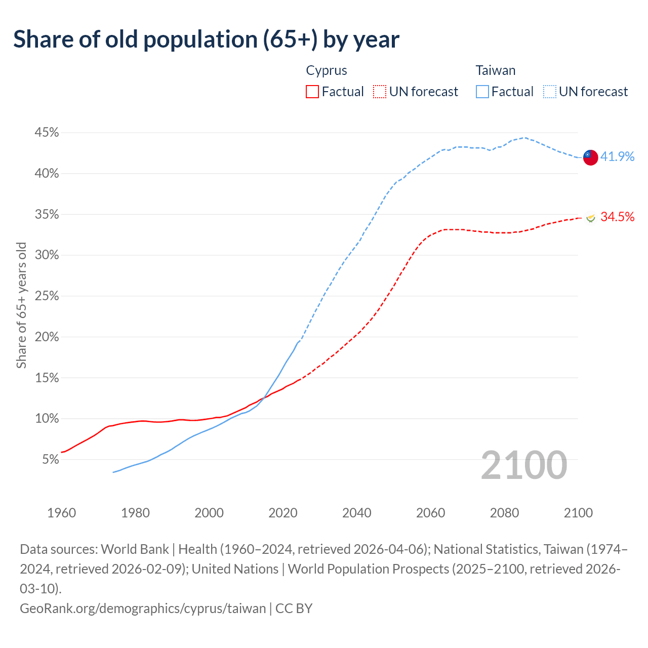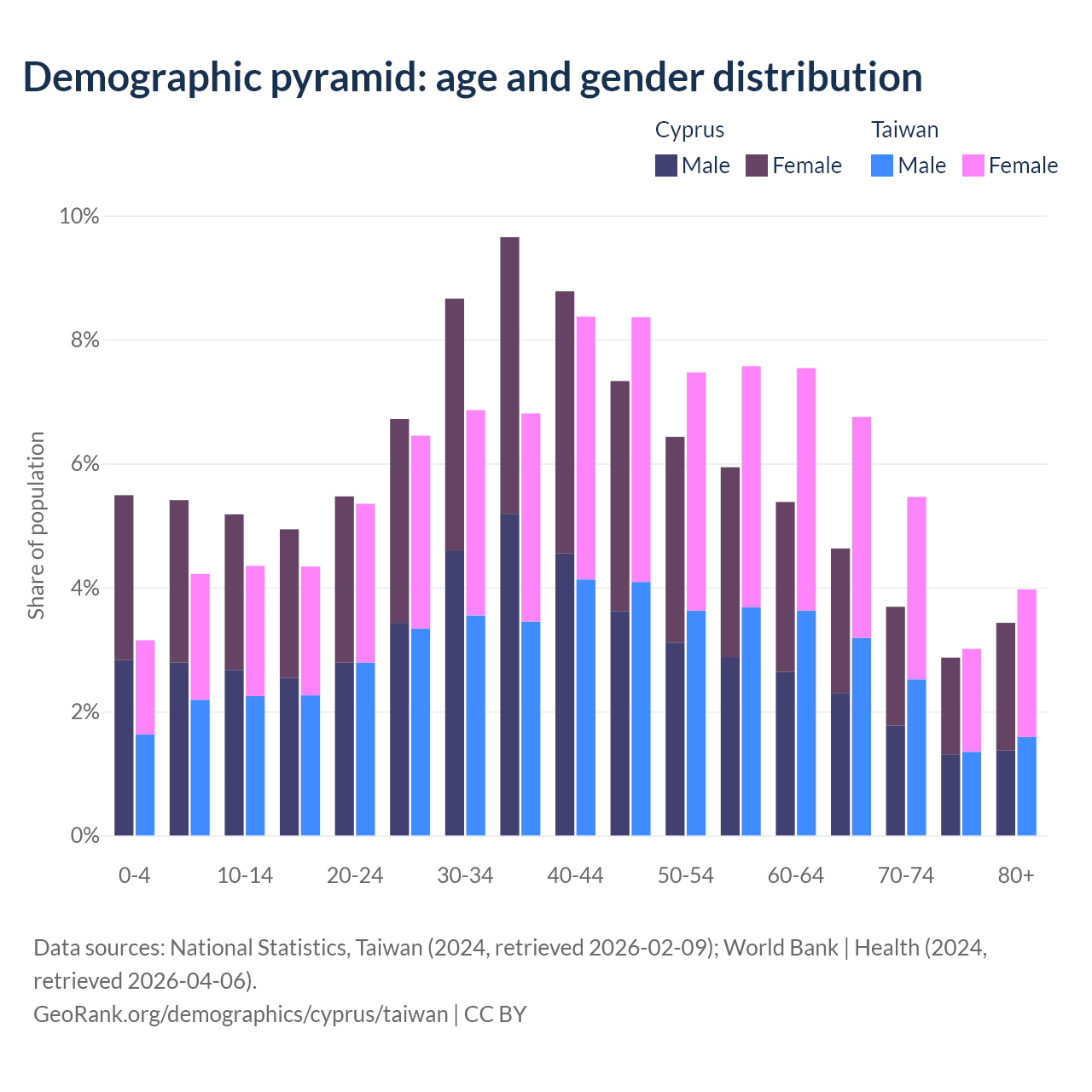 The share of older people aged 65 and over is 14.6% in Cyprus and 19.2% in Taiwan. Life expectancy in Cyprus compared to Taiwan .