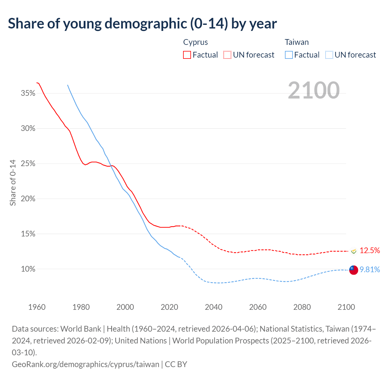 - The share of young demographic (0-15 years old) in Cyprus is 16.1% vs 11.7% in Taiwan.