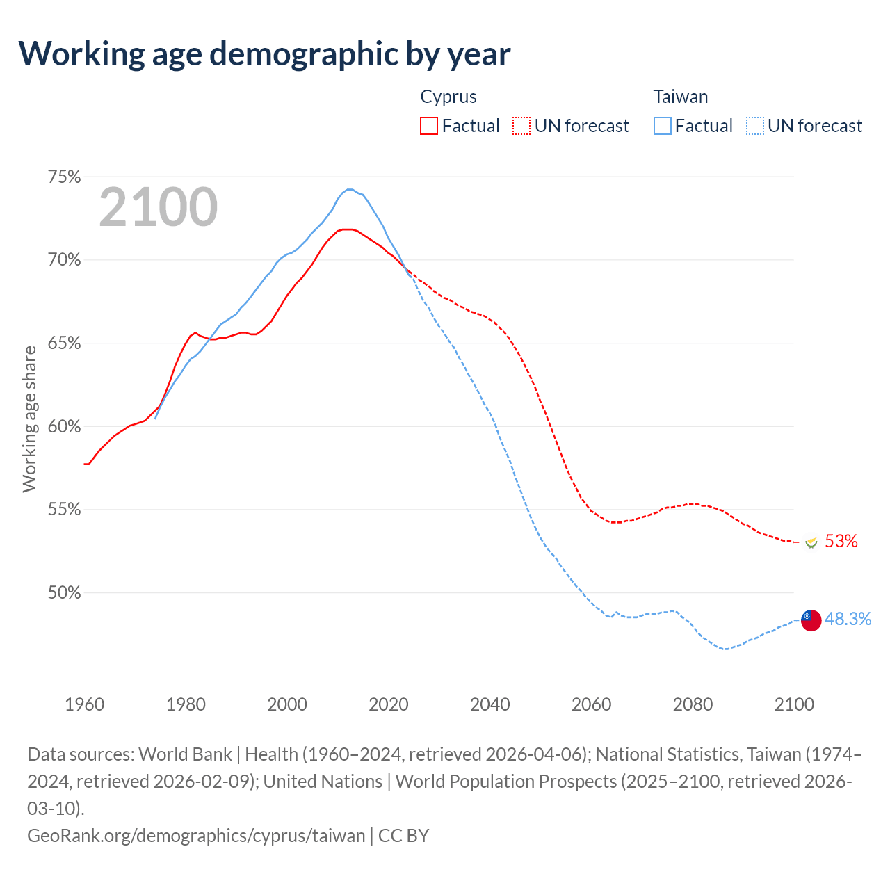 Median age Cyprus vs Taiwan, 1960-2100