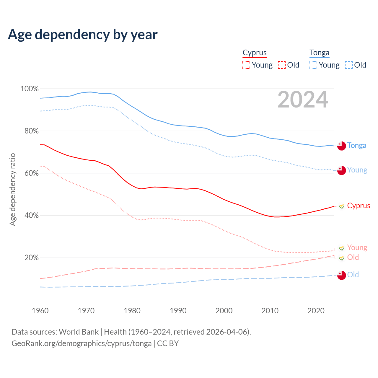 The share of older people aged 65 and over is 14.6% in Cyprus and 6.72% in Tonga. Life expectancy in Cyprus compared to Tonga .