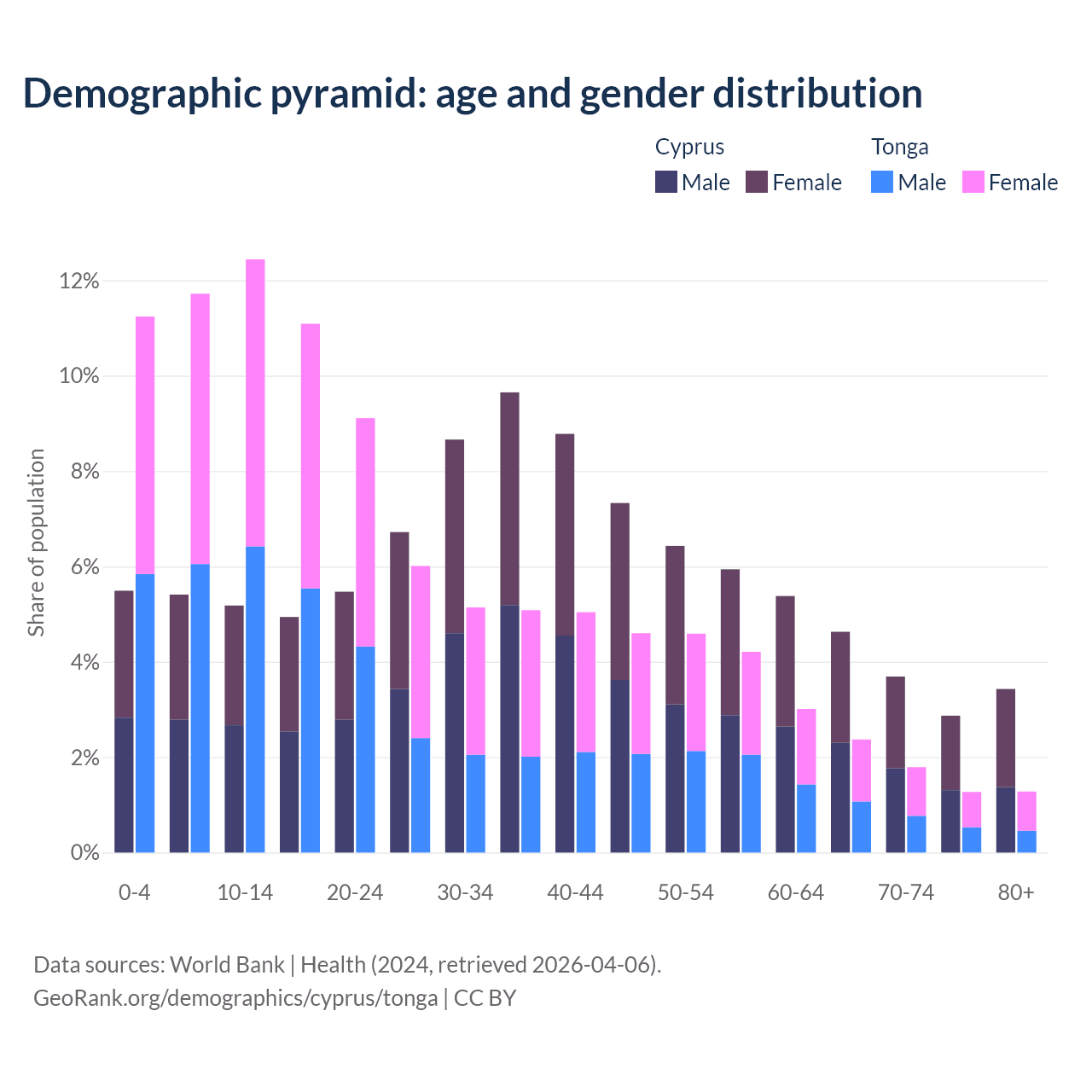- As of 2026, the population of Cyprus is 1.39M vs 103K in Tonga - 13.4 times difference.