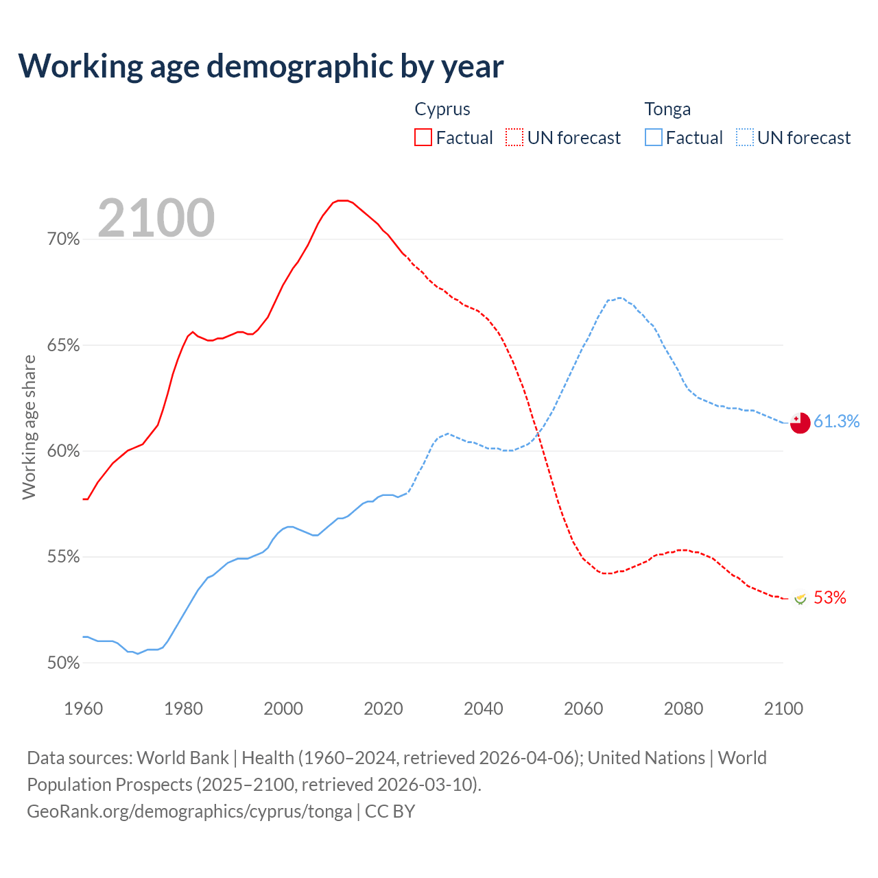 - Cyprus has 961K working age adults (aged 15-64) vs 59.8K in Tonga.