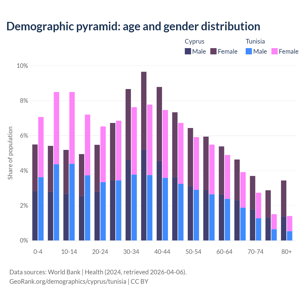 - Cyprus is ranked 52/196 by median age (oldest to youngest) vs 86/196 for Tunisia.