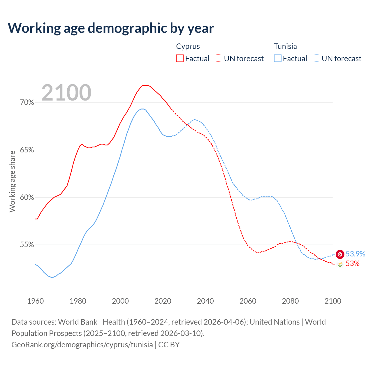 - Cyprus has 961K working age adults (aged 15-64) vs 8.26M in Tunisia.