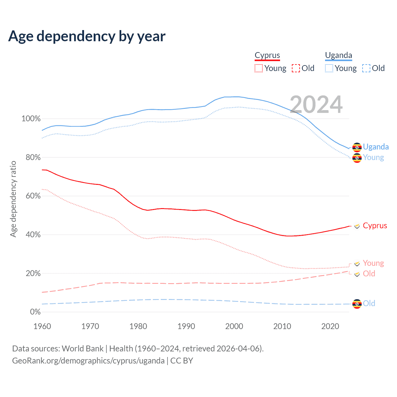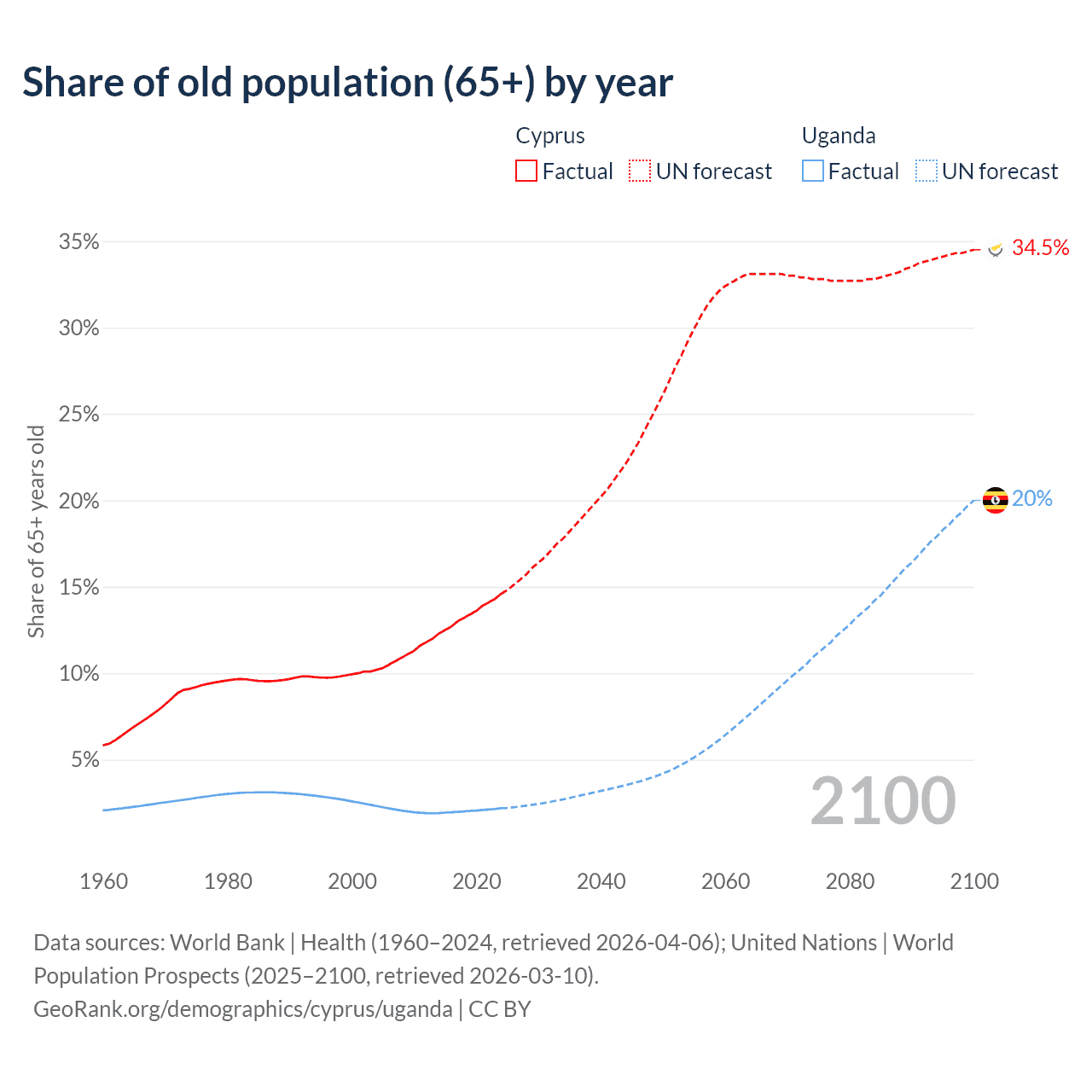The share of older people aged 65 and over is 14.6% in Cyprus and 2.19% in Uganda. Life expectancy in Cyprus compared to Uganda .