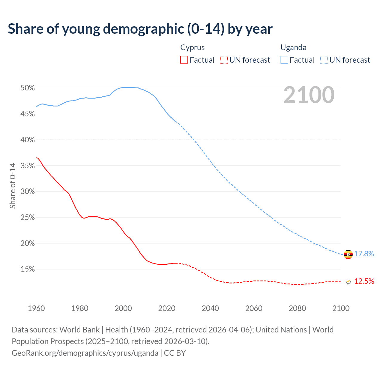 - The share of young demographic (0-15 years old) in Cyprus is 16.1% vs 43.5% in Uganda.