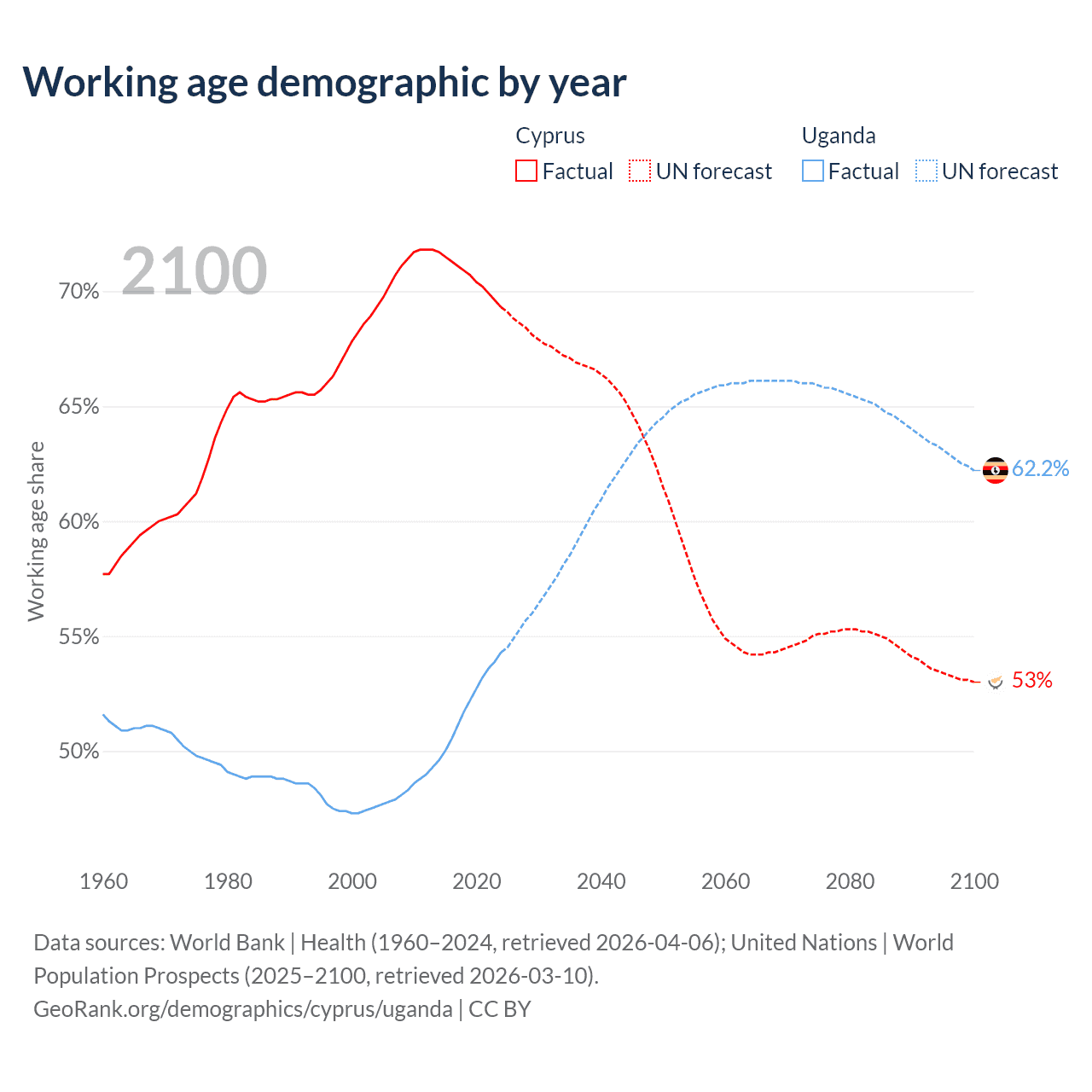- Cyprus has 961K working age adults (aged 15-64) vs 28.9M in Uganda.