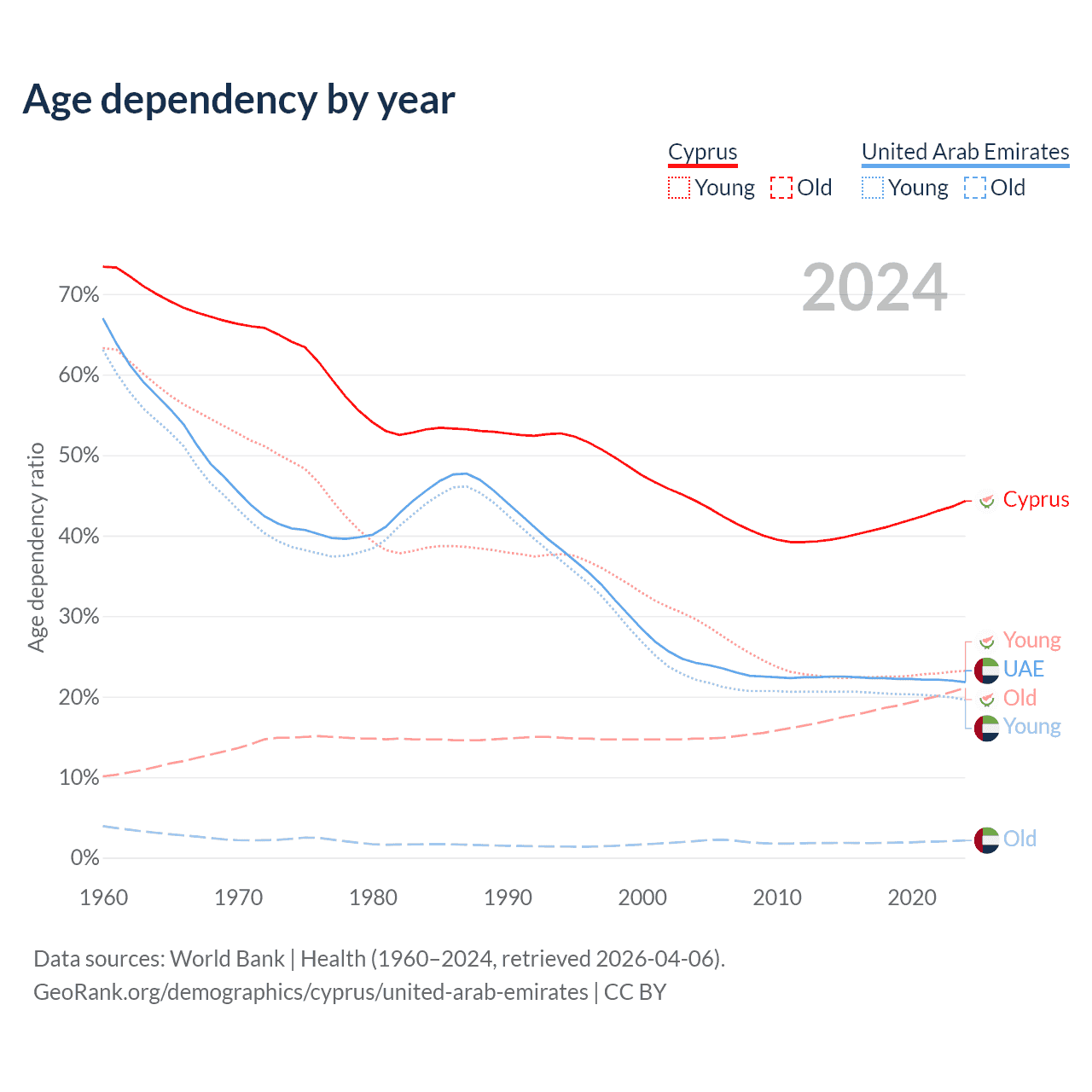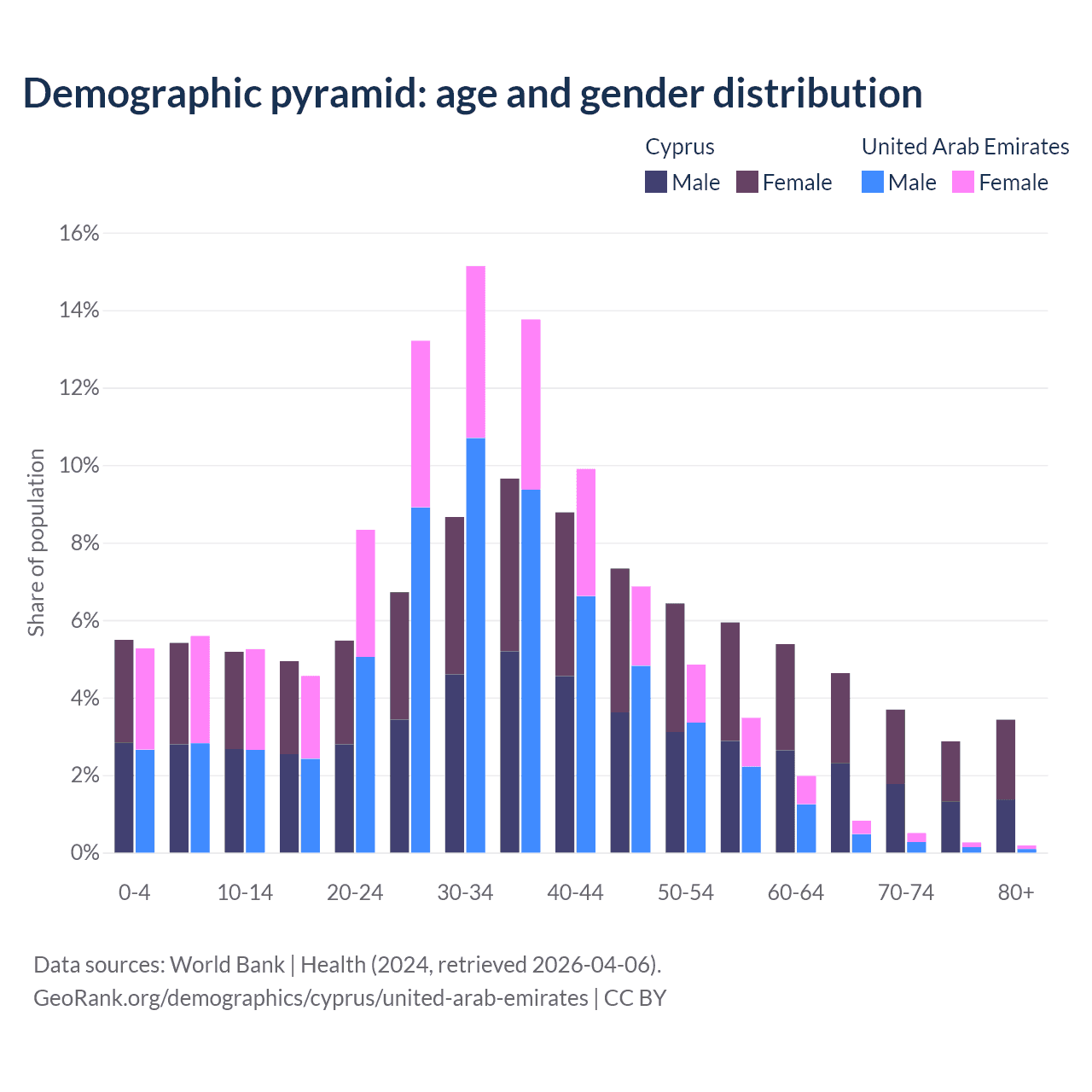 - Cyprus is ranked 52/196 by median age (oldest to youngest) vs 91/196 for the United Arab Emirates.