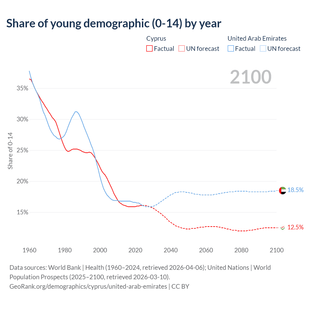 - The share of young demographic (0-15 years old) in Cyprus is 16.1% vs 16.1% in the United Arab Emirates.