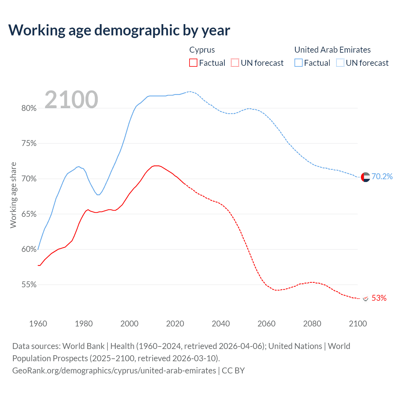 The share of older people aged 65 and over is 14.6% in Cyprus and 1.77% in the United Arab Emirates. Life expectancy in Cyprus compared to the United Arab Emirates .